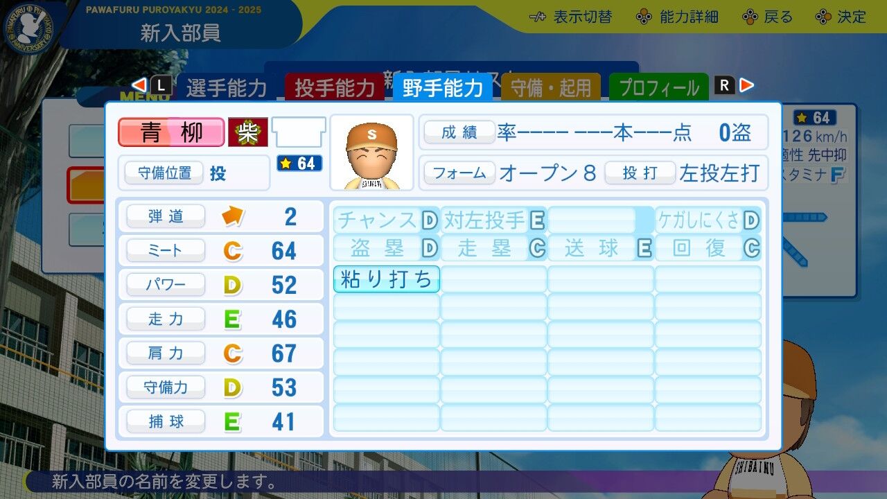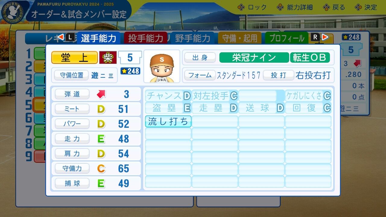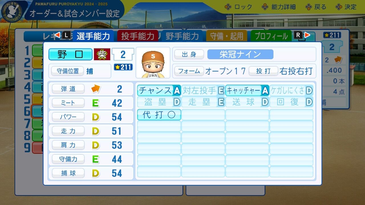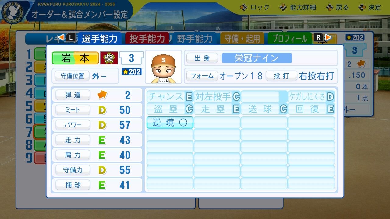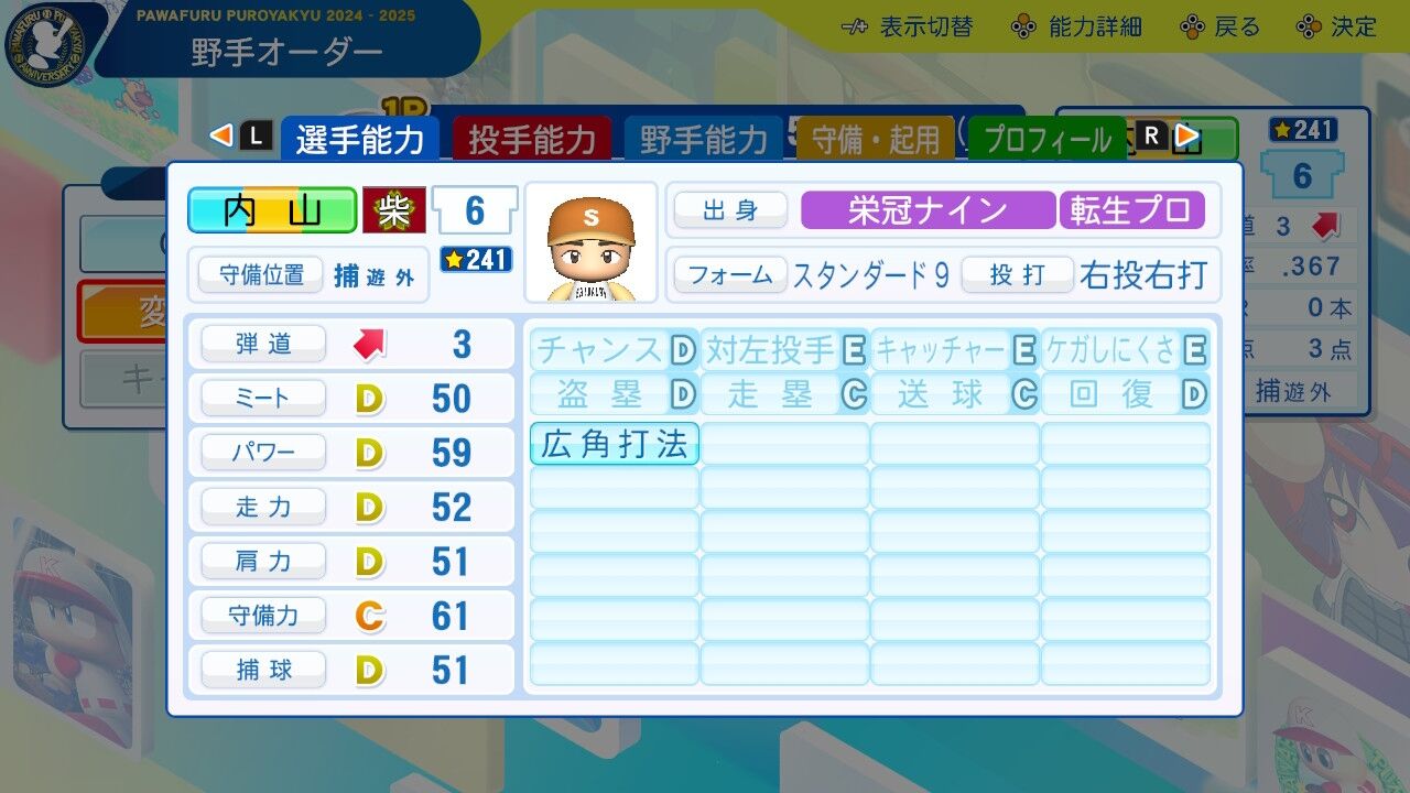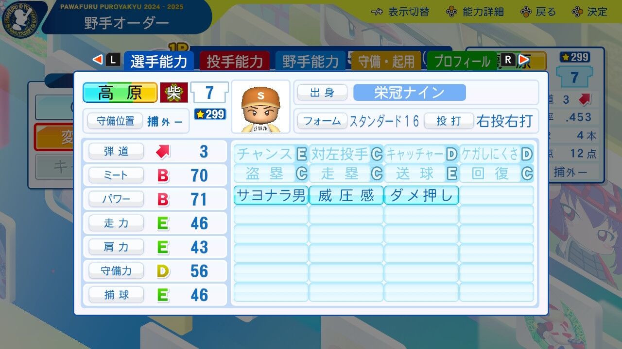 特訓でだったかな?アベレージヒッターを習得し将来性に磨きがかかった。今は8番だけど来年はクリンナップ打ってるかもしれんね。