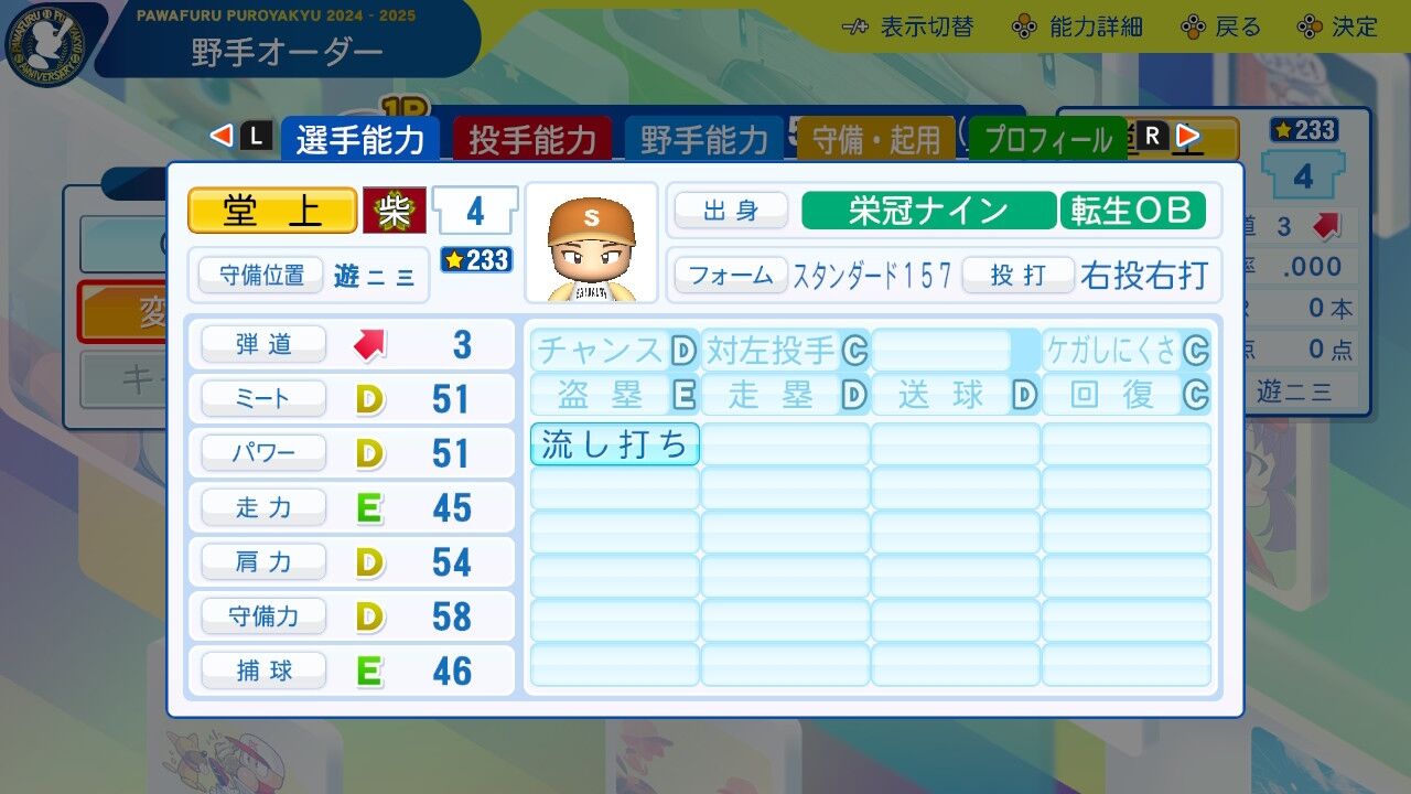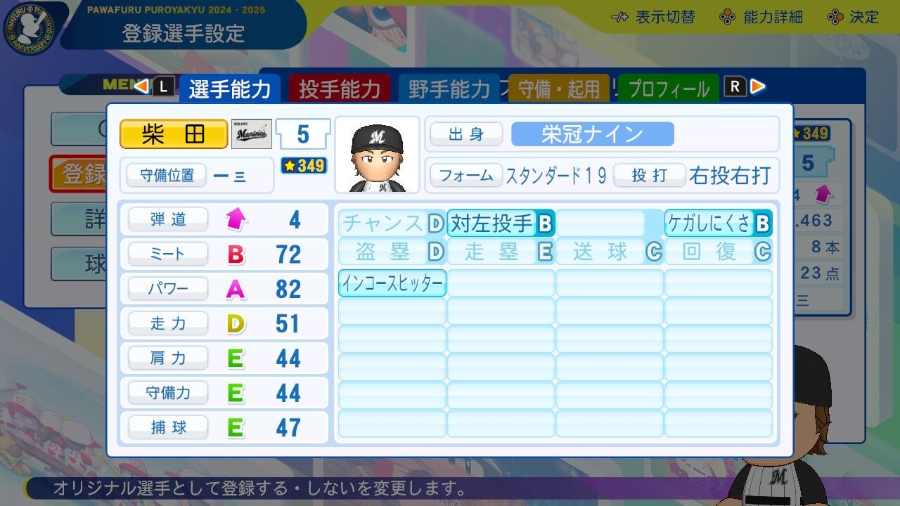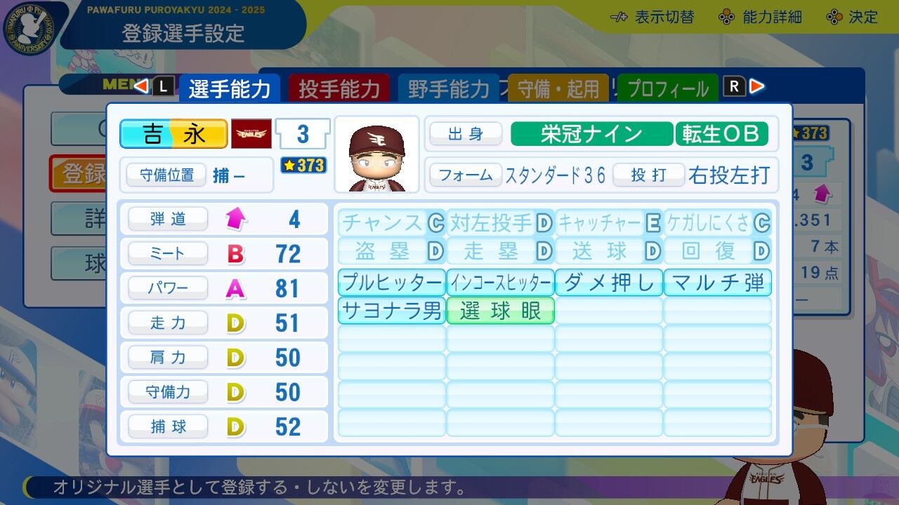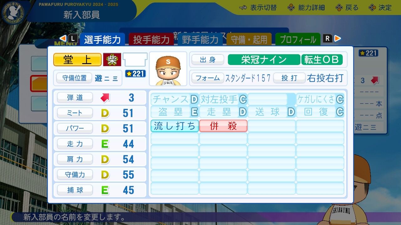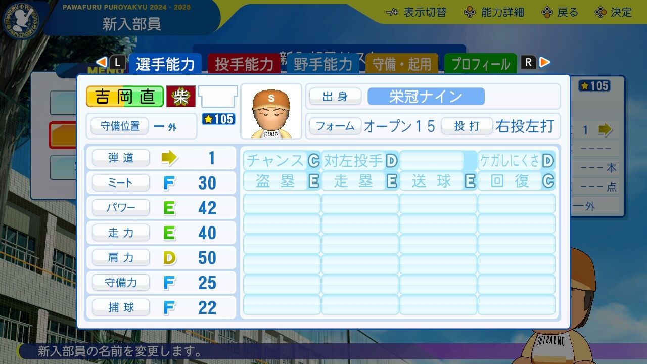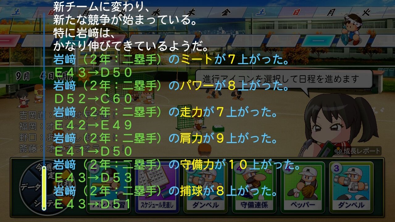 特訓でだったかな?アベレージヒッターを習得し将来性に磨きがかかった。今は8番だけど来年はクリンナップ打ってるかもしれんね。