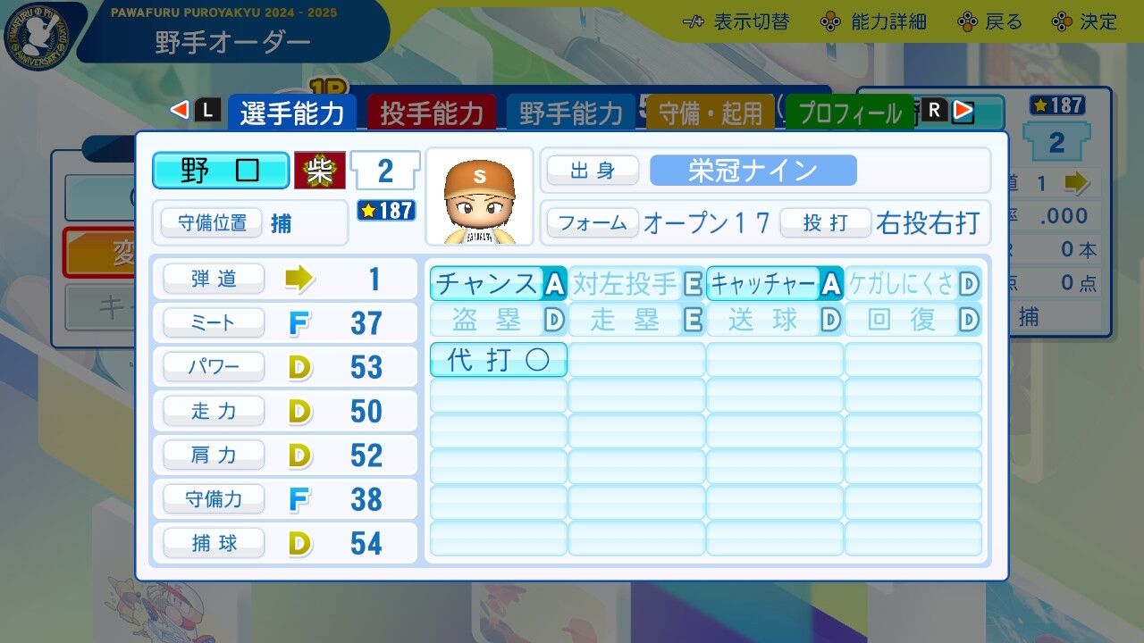 キャッチャー能力に目が行くが、チャンスA持ってるのも相当エラい。6番バッターとしてポイントゲッターになって欲しい。