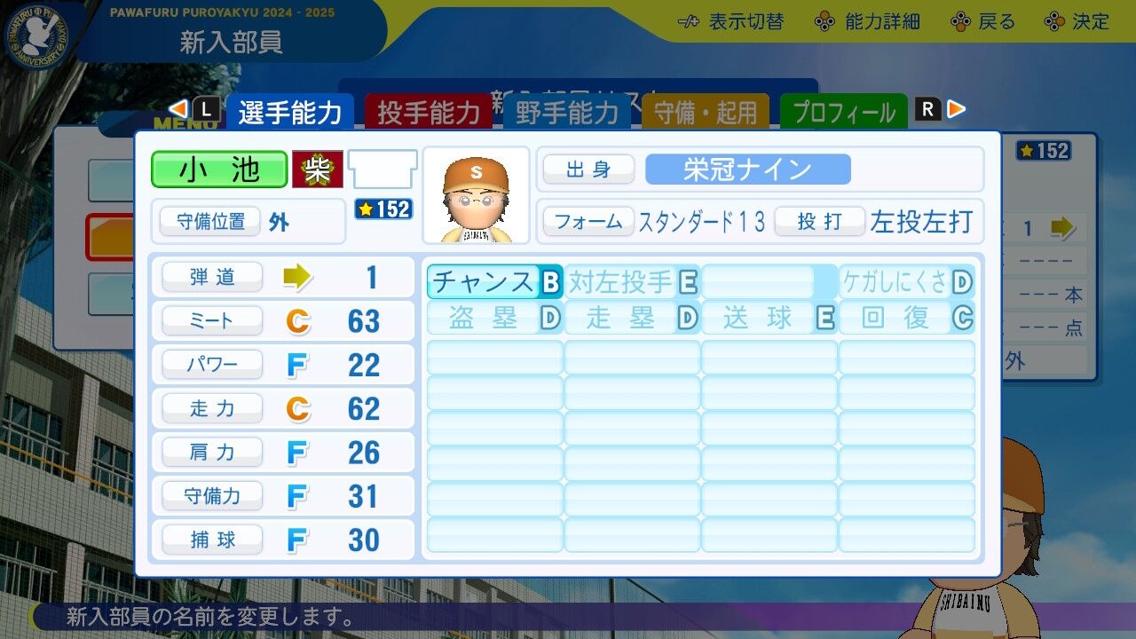 野手転向した実質天才型。3年生でもおかしくない能力してる。夏大会でも代打でホームランを打つなど、新チームの主力として風格十分。