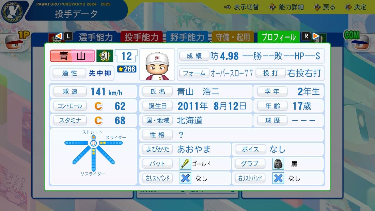 こちらも1年から正捕手起用。天賦の才でキャッチャーAを持つ男。けっこうキャッチャーレベルの影響大きい気がするので、彼の現役中がチャンスかもしれない。
