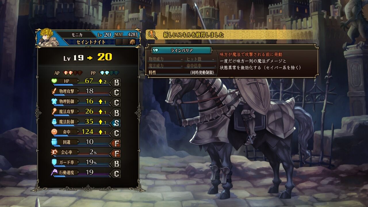モニカが「ラインバリア」を習得。列ごと魔法攻撃から守ることができる。強いんだけどコストが重いのが難点。これまではセイントナイトに追撃の腕輪とか持たせてたんだけどどうしようかな。