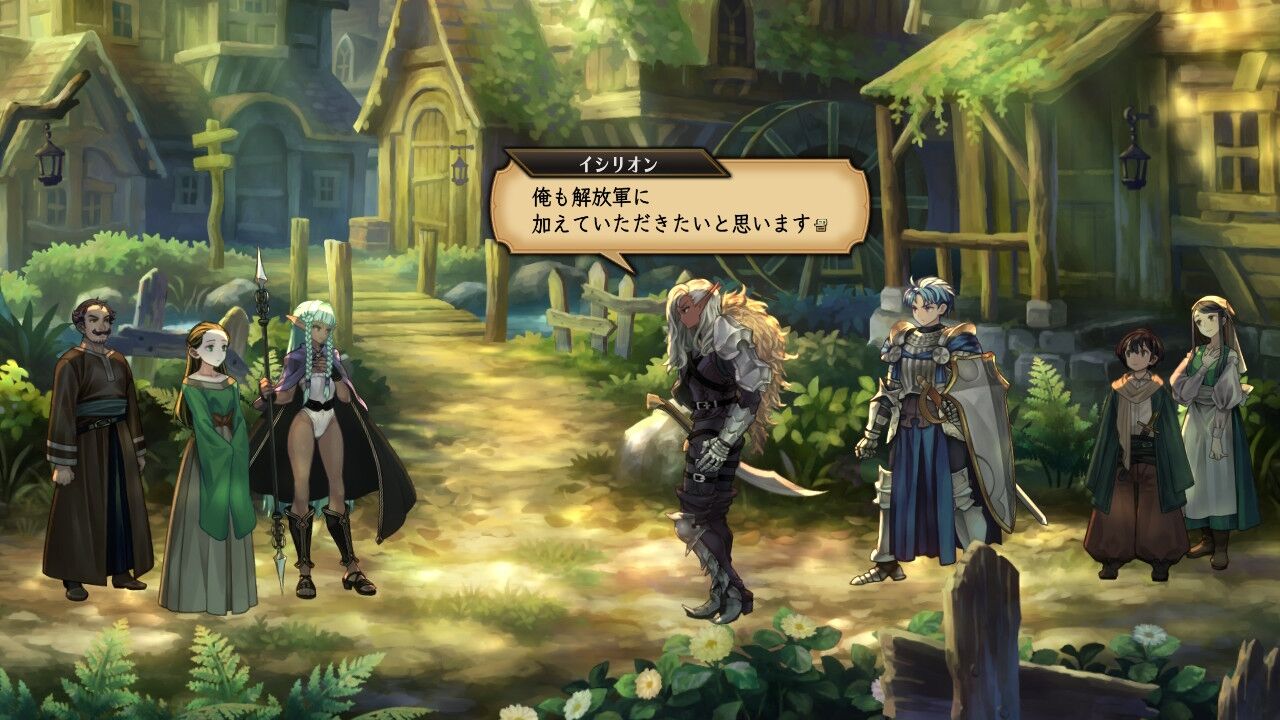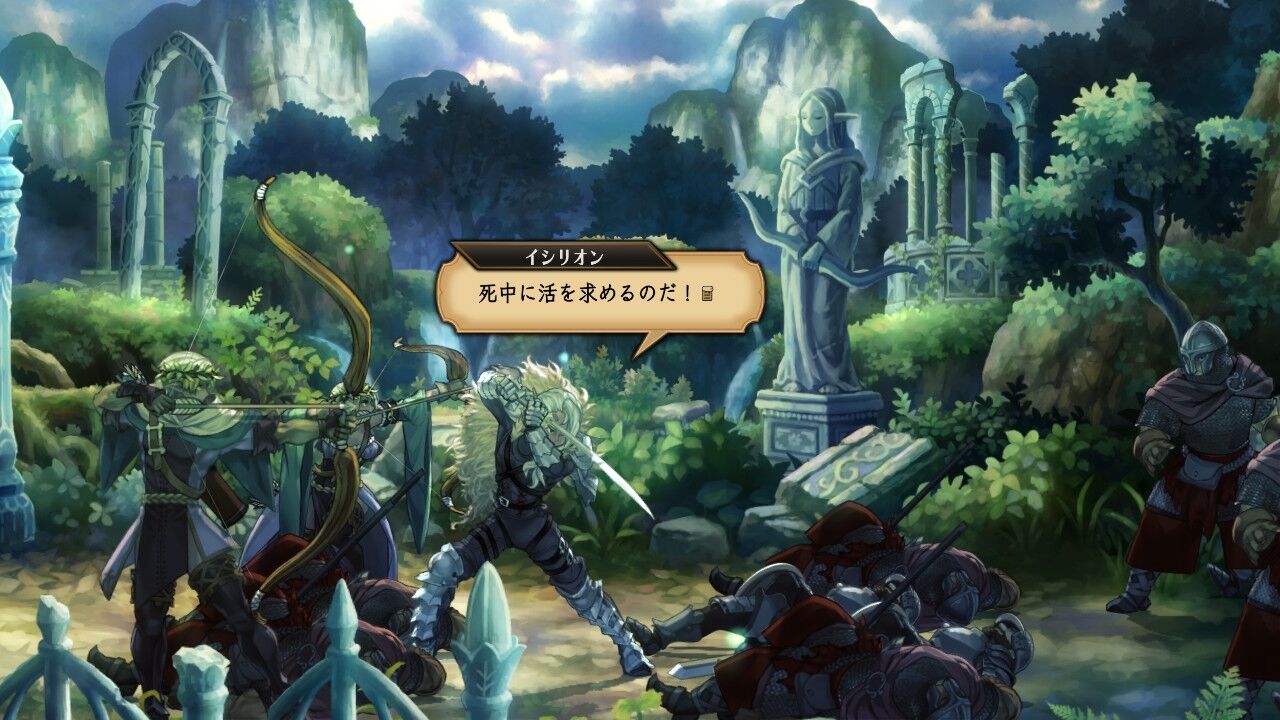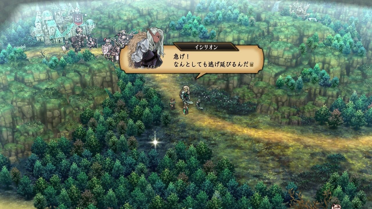 ゼノイラ軍から逃げるエルフの一団と、それを率いるエルフの剣士・イシリオン。