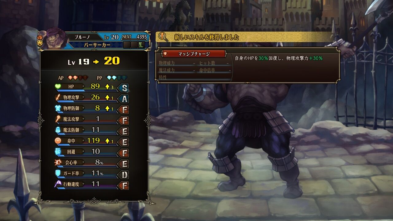 ブルーノが「マッシブチャージ」を習得。体力を回復しつつ自身に攻撃力バフをかけるアクティブスキル。アクティブでもパッシブでも自己回復が可能になり、HPで受けるタンクとしての役割がより強化された。列攻撃とトレードオフになるのが悩みどころだが、体力減ってる時にはこれ使うように設定しとこう。