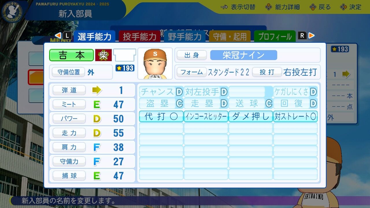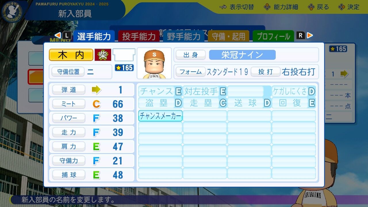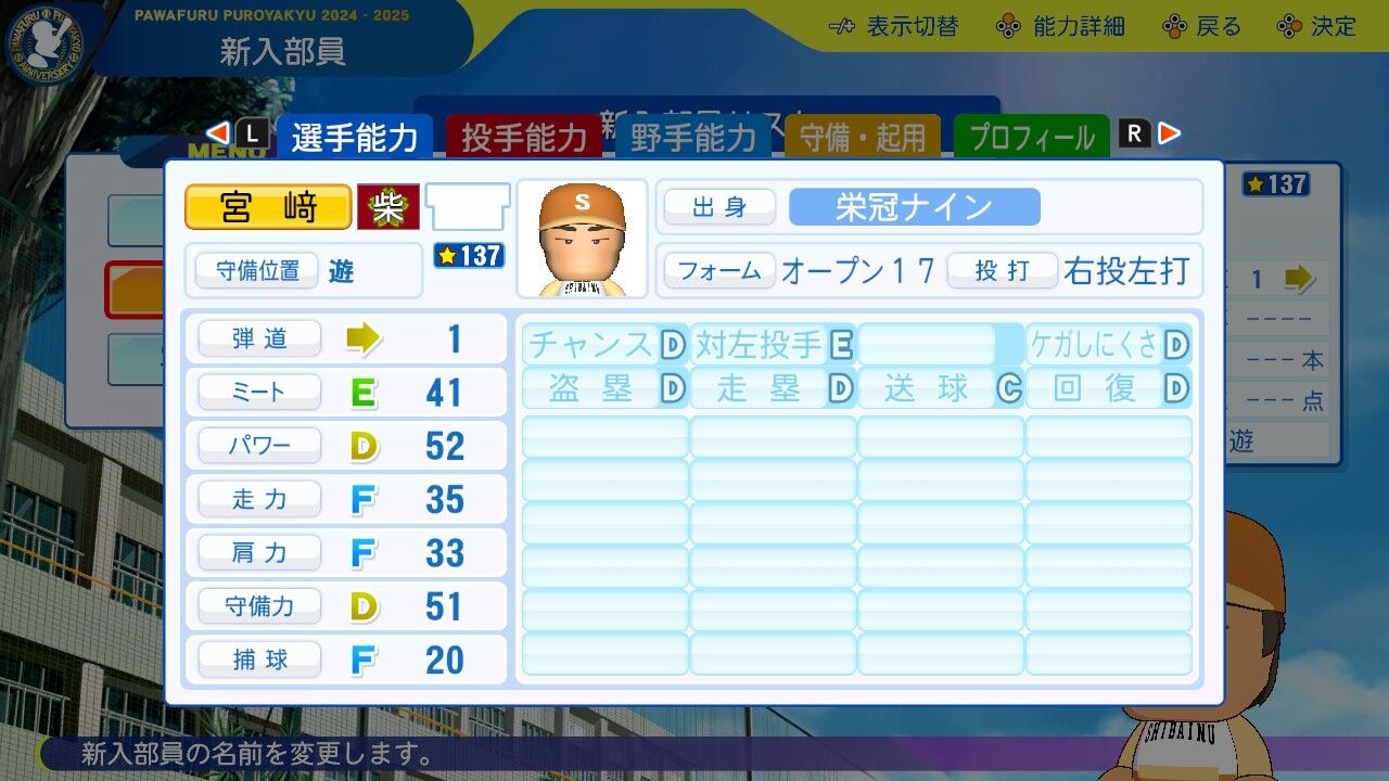 夏大会では3年生をも凌ぐ活躍を見せた新たな主砲。パワーはすでにほぼA。引退までにミートパワーAAいけるなこれ。