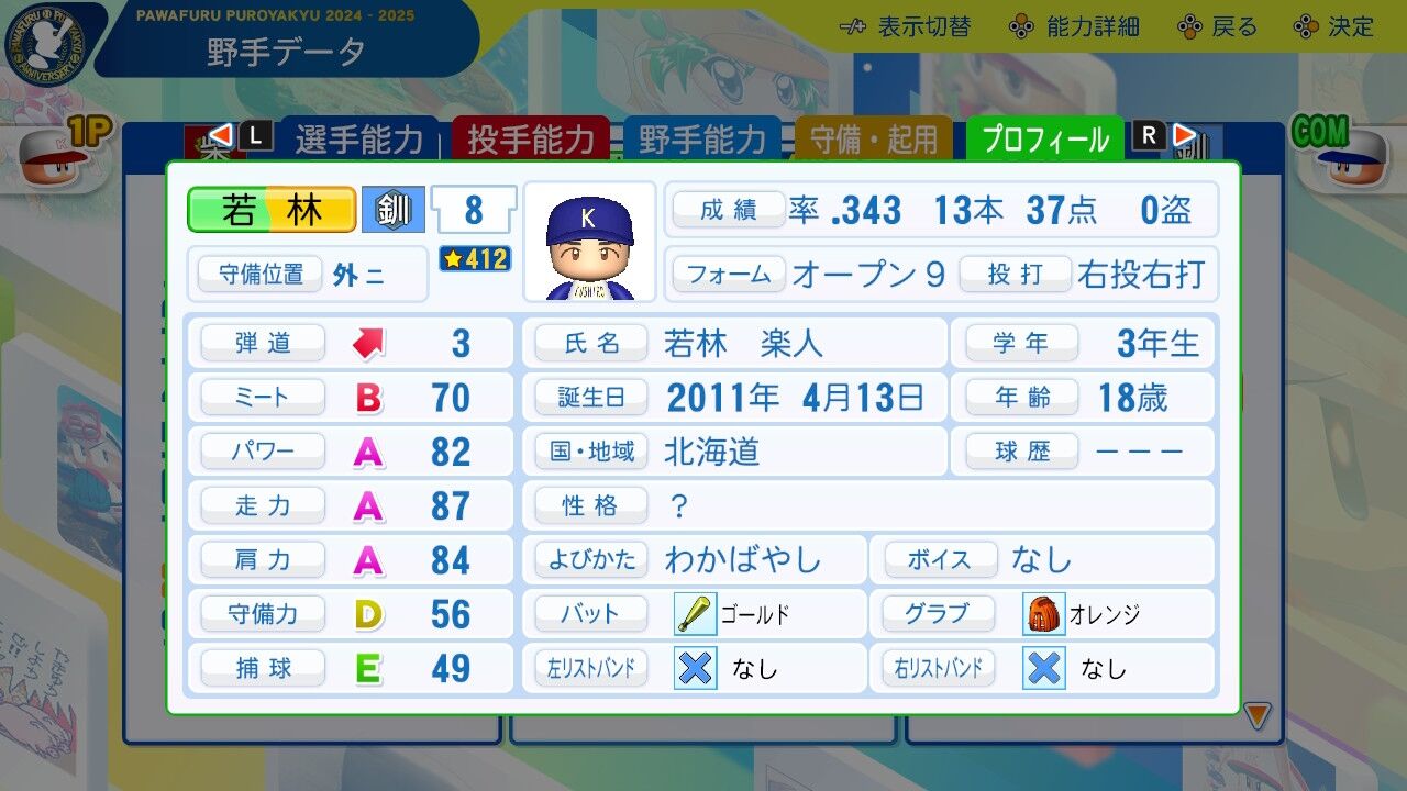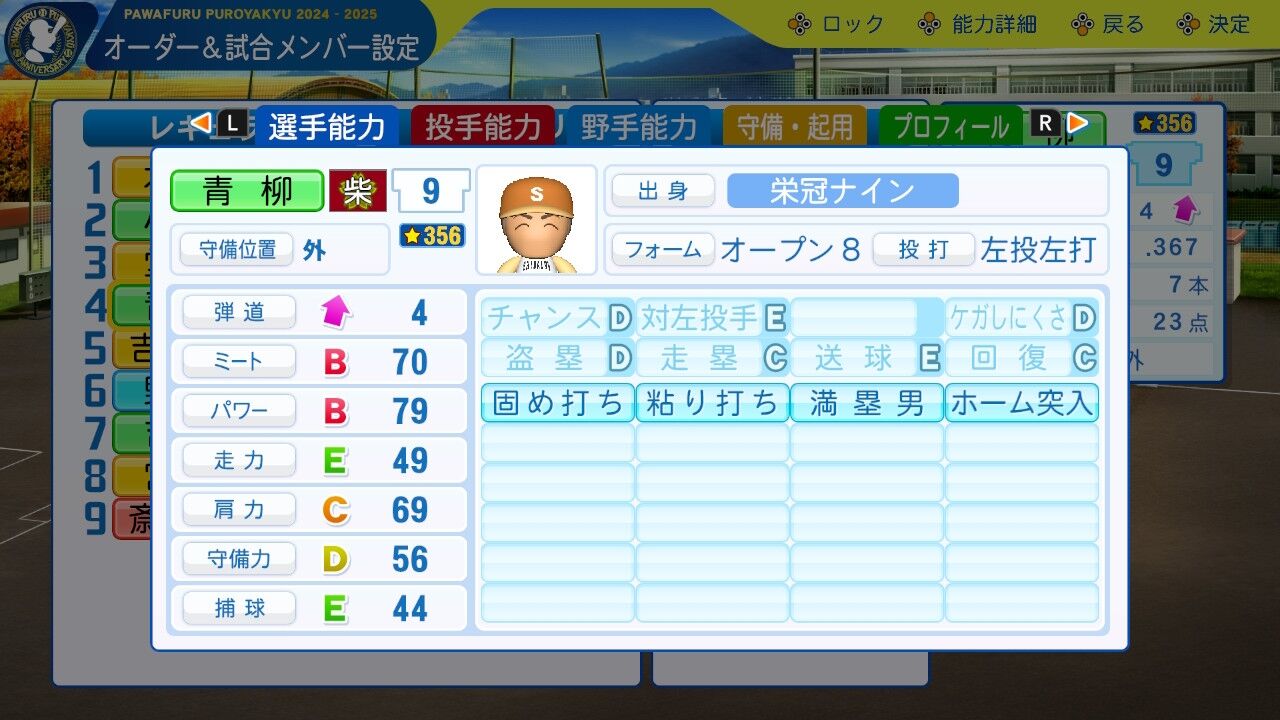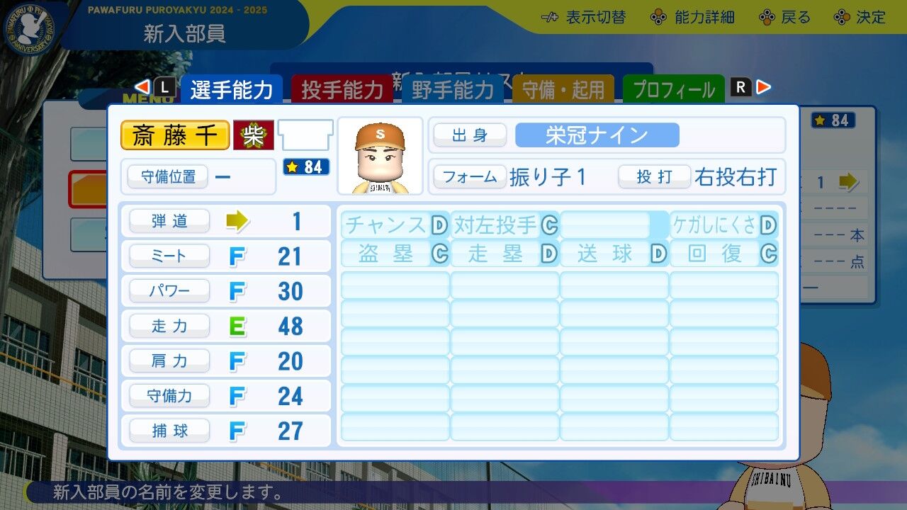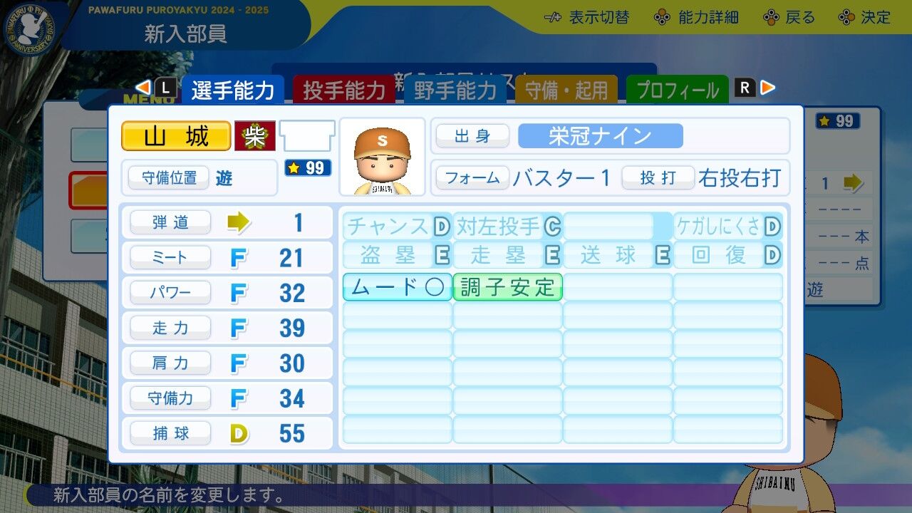 夏大会では3年生をも凌ぐ活躍を見せた新たな主砲。パワーはすでにほぼA。引退までにミートパワーAAいけるなこれ。