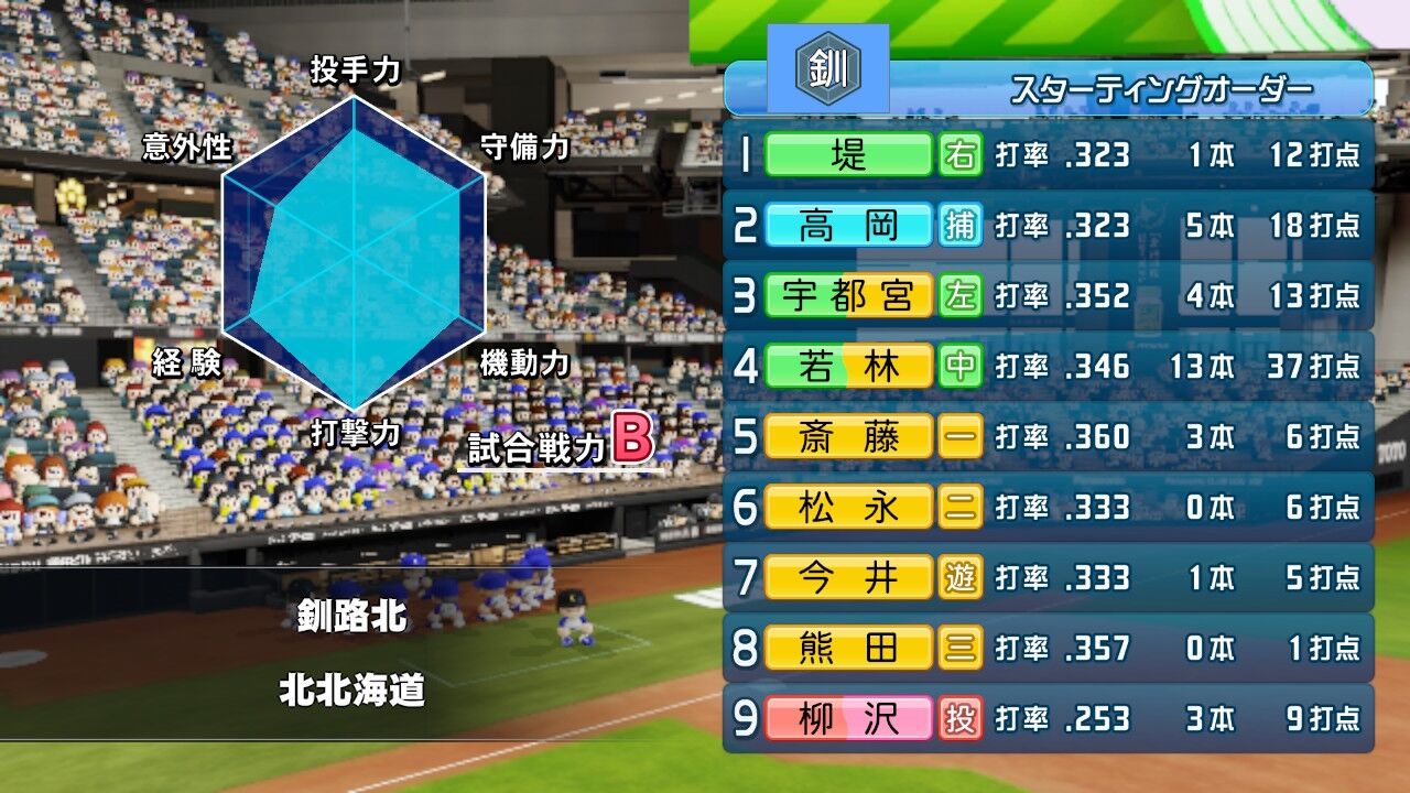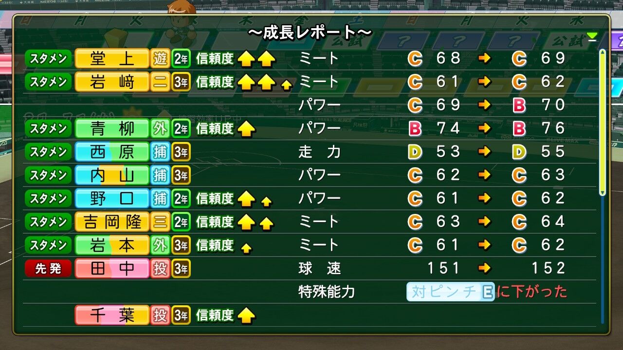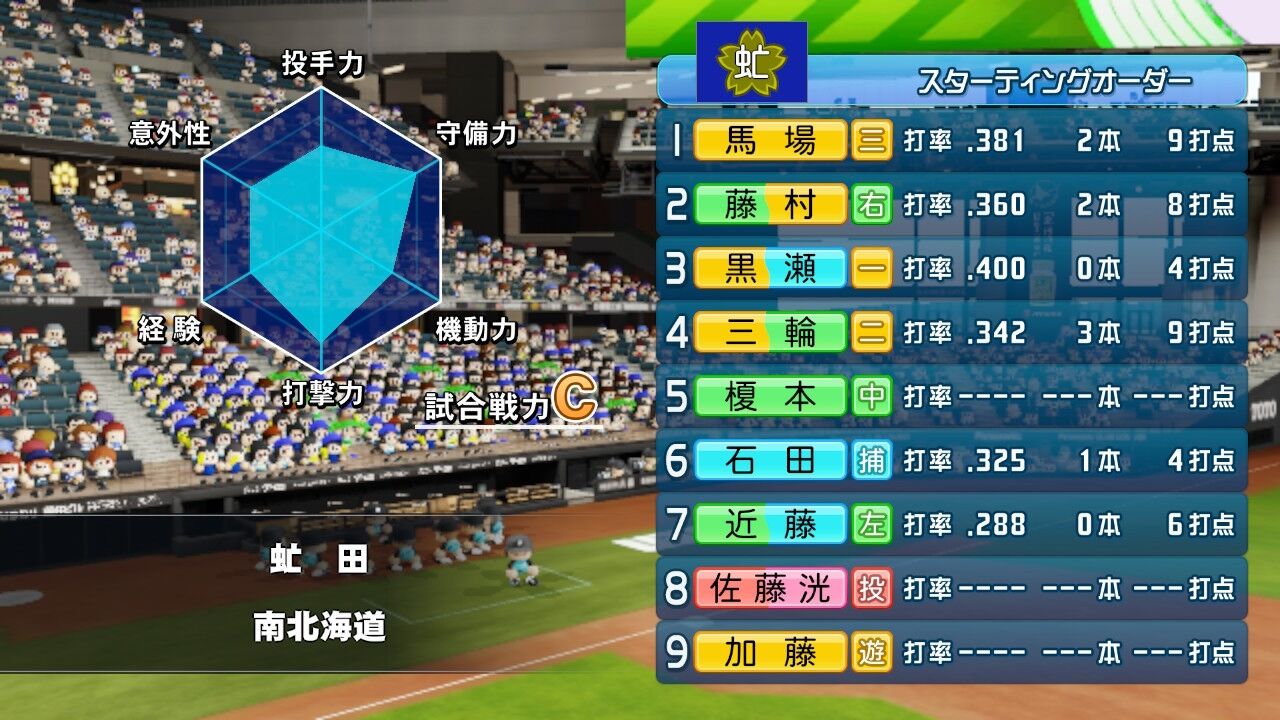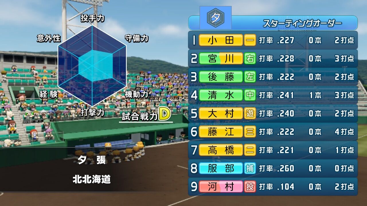 甲子園の経験値ウマーではあるのだが、道大会から田中の対ピンチがモリモリ下がってるのがストレス。入学時BだったのにいまやE。田中はエースとしてそれなりによくやっていると思うのだが……。ちょっと打たれたくらいで下がるの酷すぎんか?