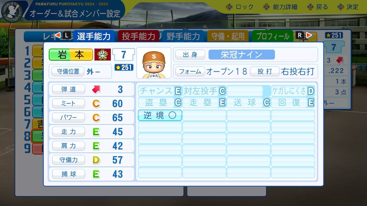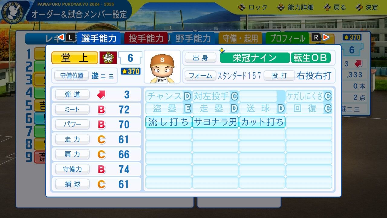 同じ覚醒済選手で学年も上だが堂上より一回りショボいのは凡才と転生選手の差。ポジションの兼ね合いでサブポジを練習し一塁に入る。