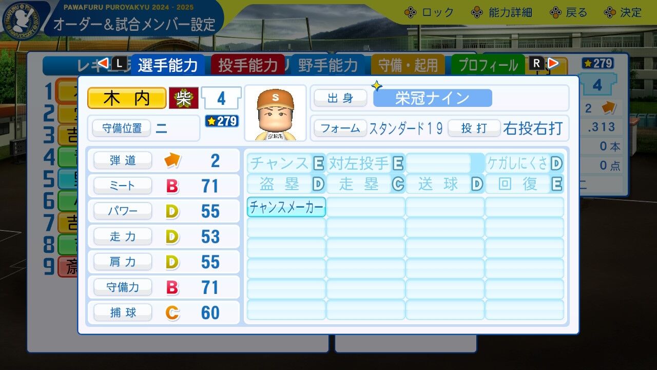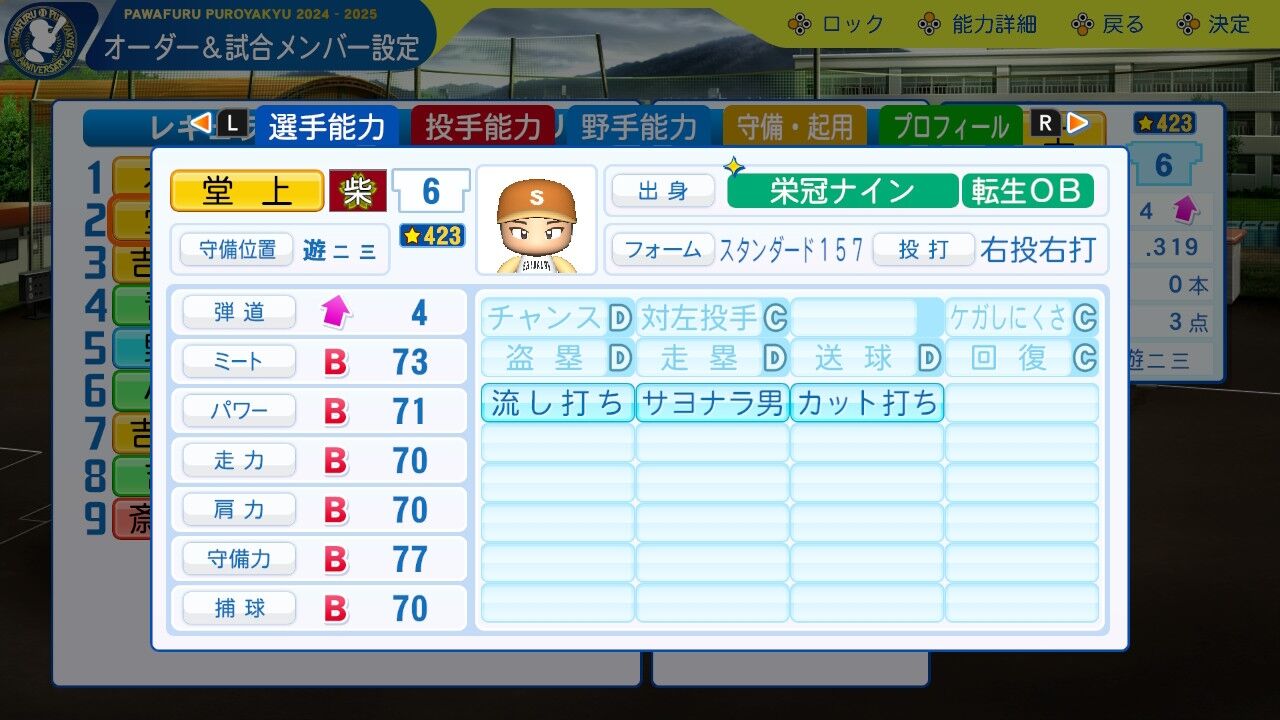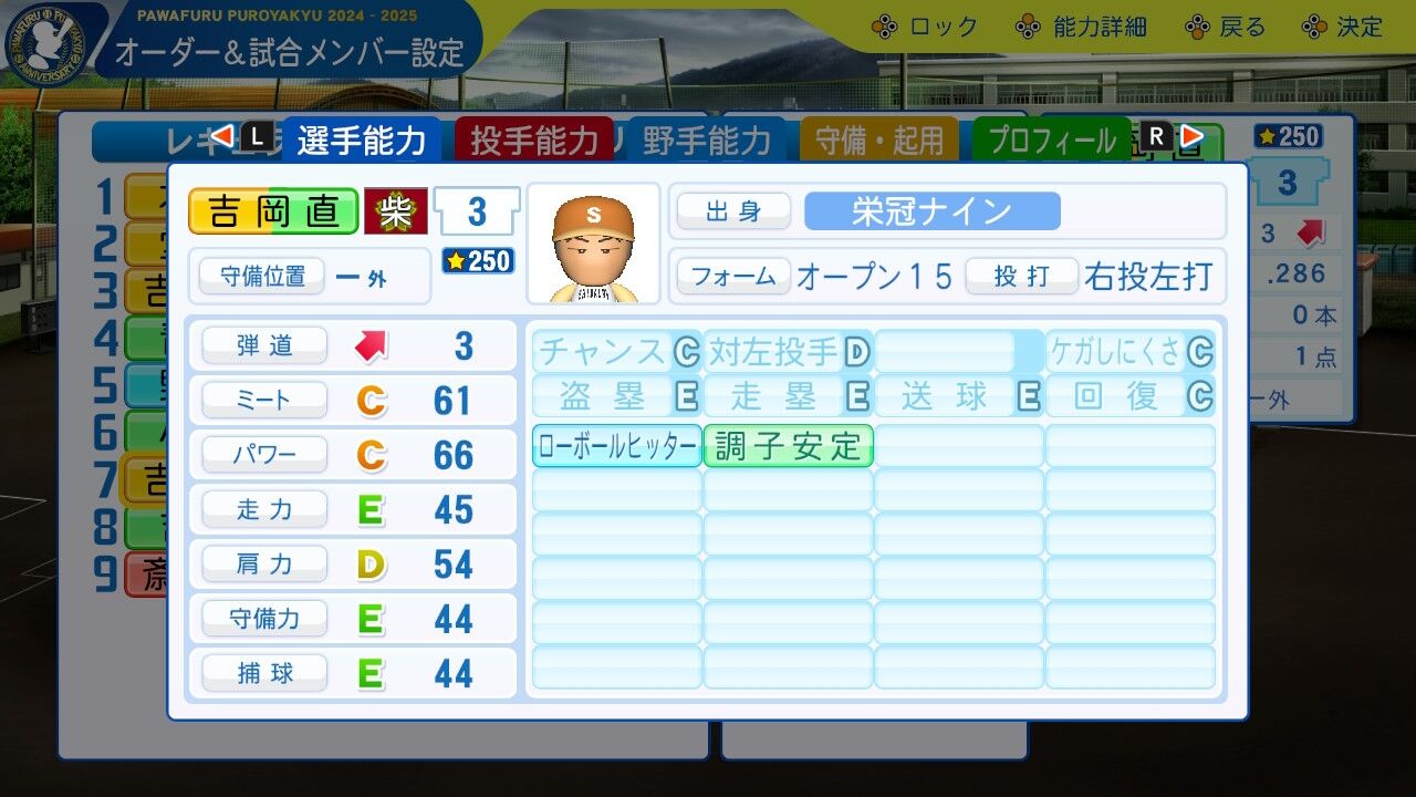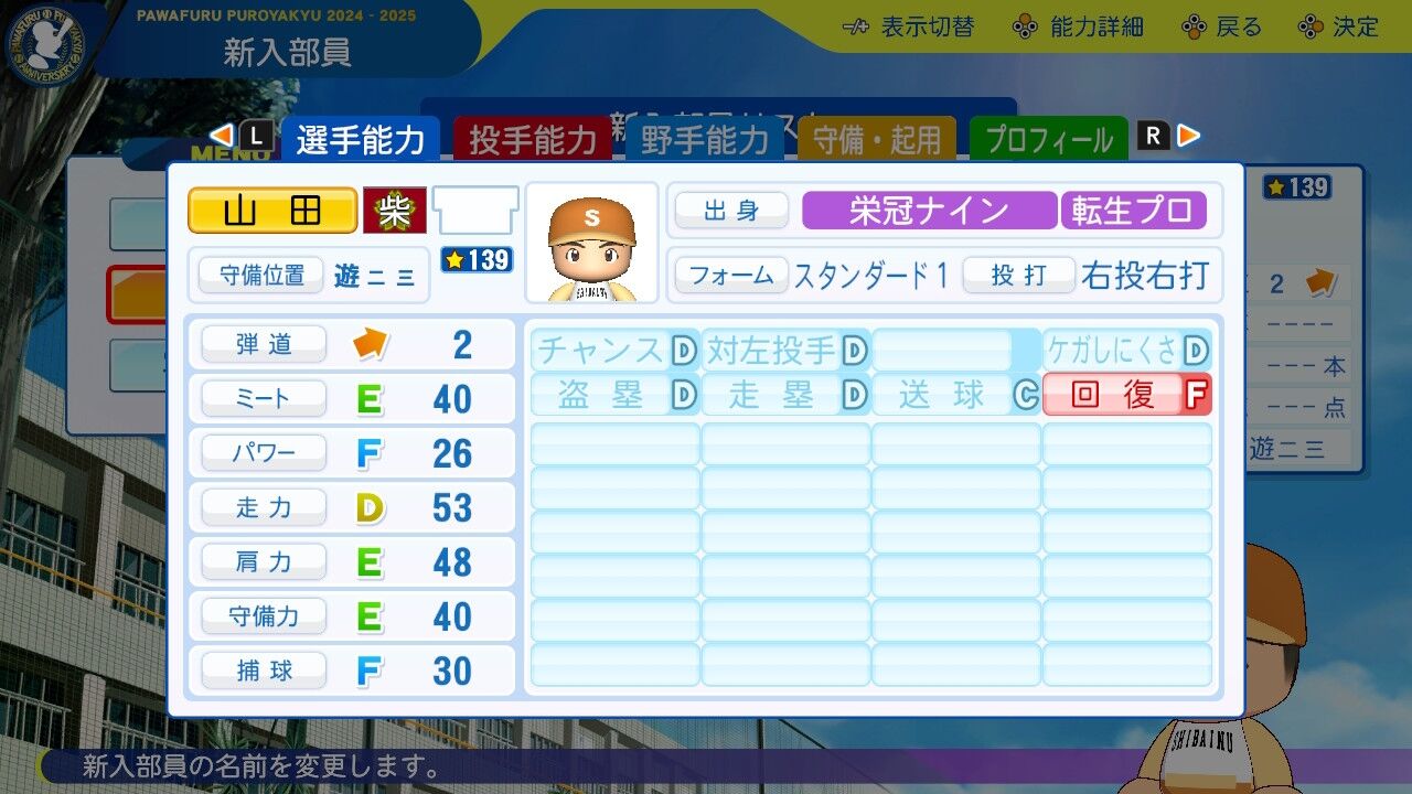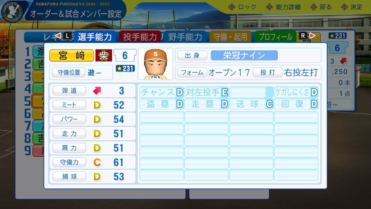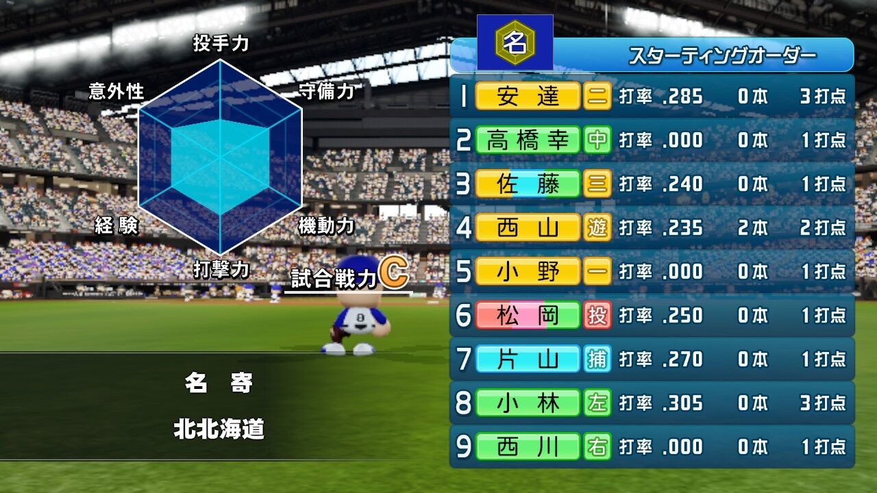 盗塁Aが光る。脚は遅いので、ゆくゆくは鍛えていきたい。