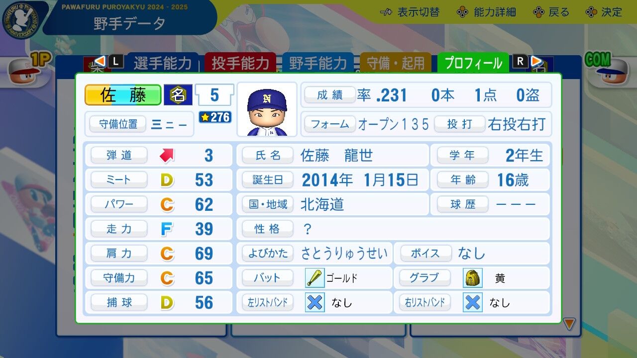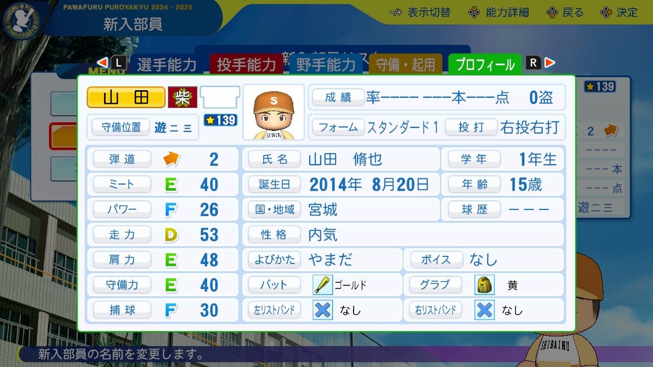 1年ながら既に穴のない能力。弾道を優先して上げていきたい。