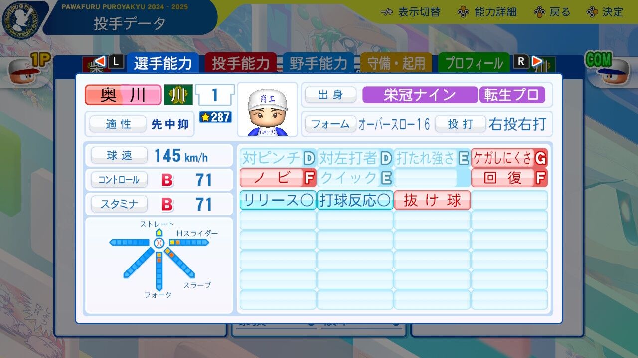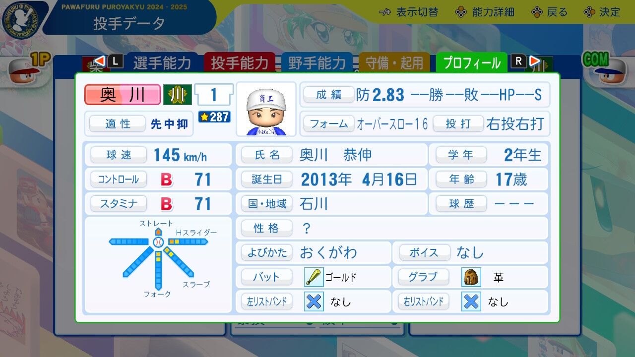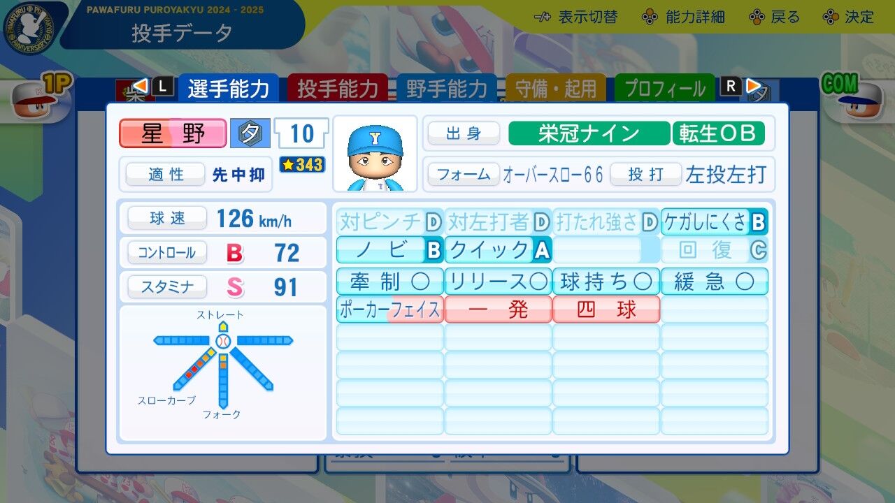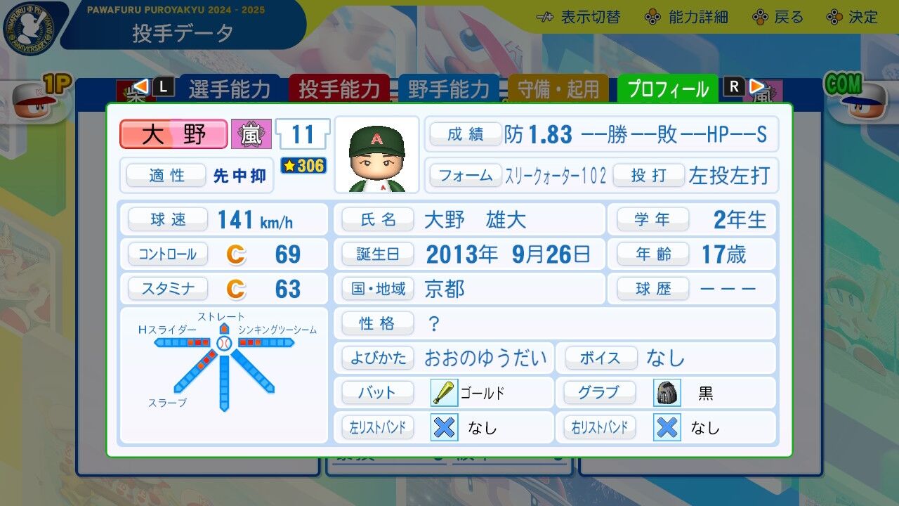 投手能力も平凡だが、他よりマシなので彼が消去法エース候補か。キレ◯持ってるのはえらい。
