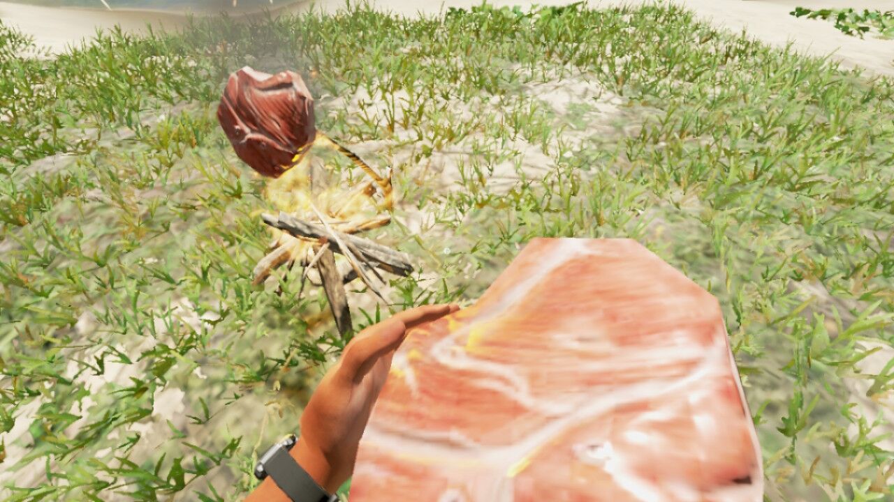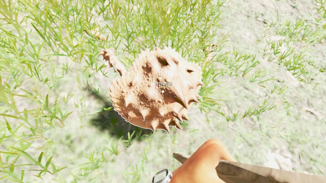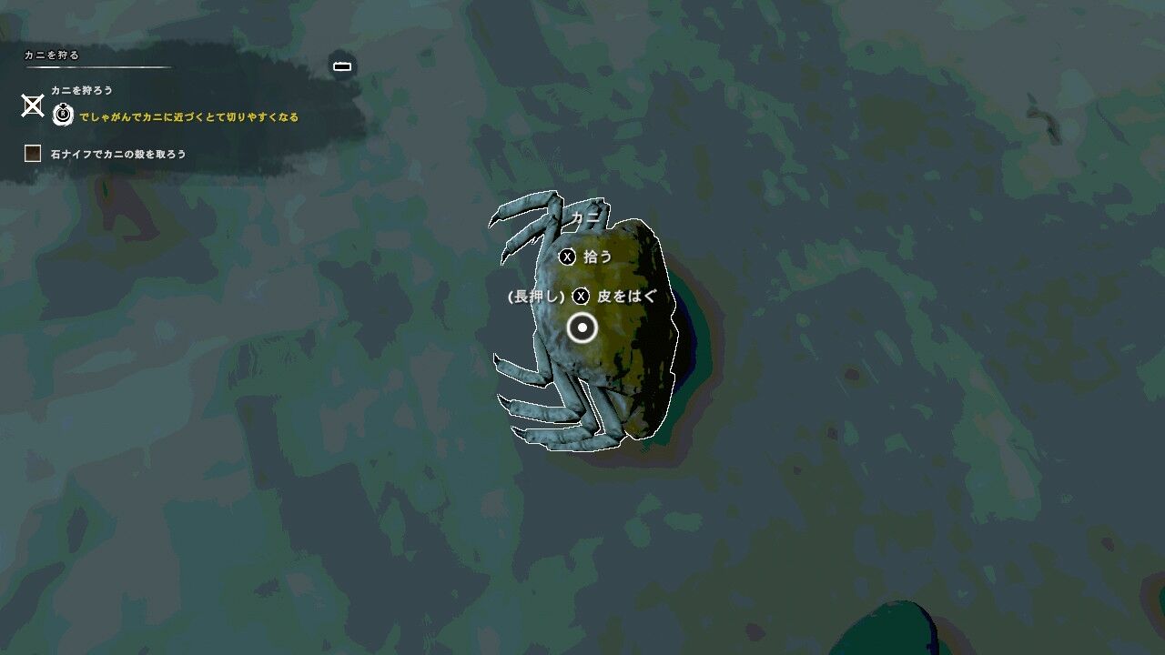 生き残るためには食料確保が必須。石で作ったナイフを使い、そのへんを歩いてたカニさんを仕留める。このまま焼いてもうまそうだが、システム的には皮をはいで肉にしなければならない。皮っていうか甲殻だよなカニの場合。