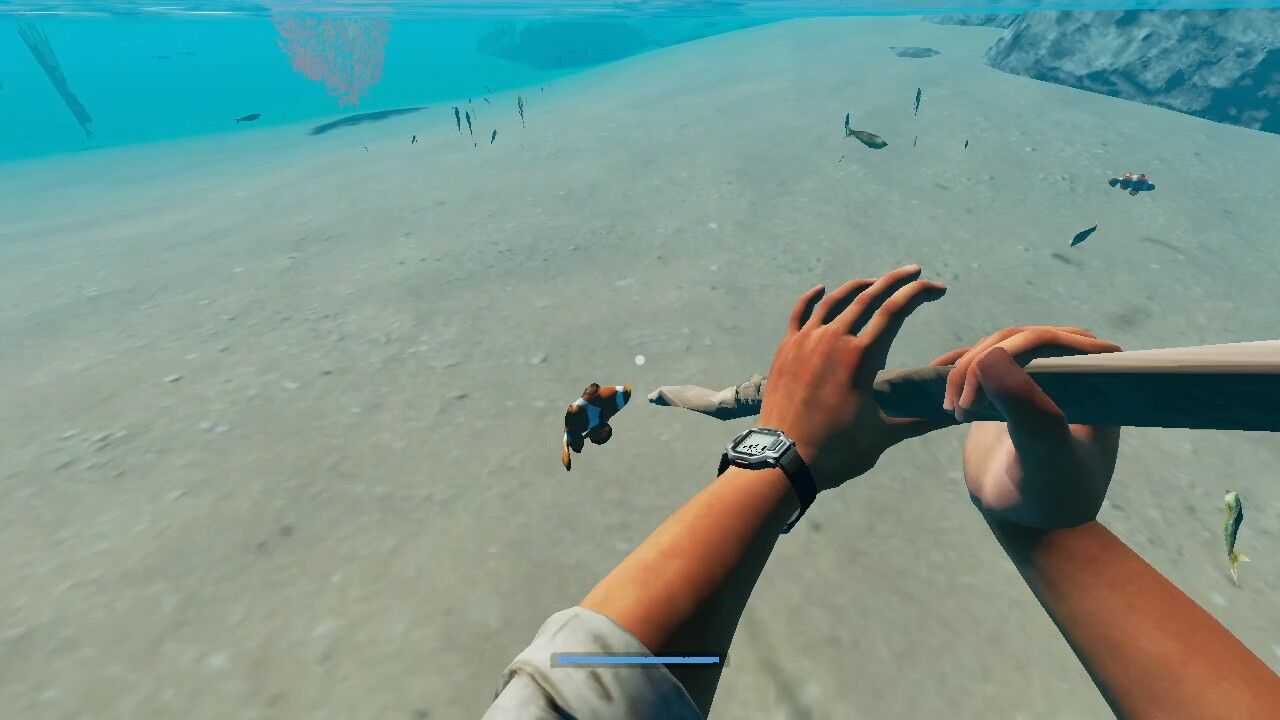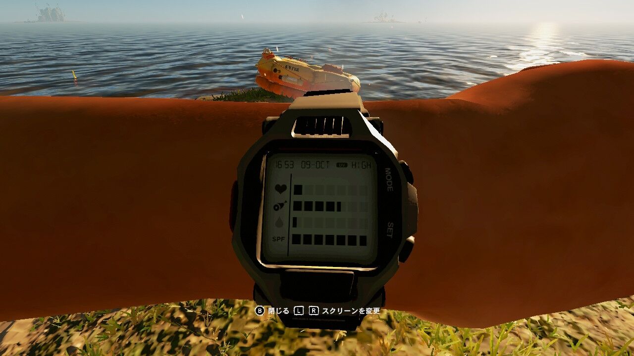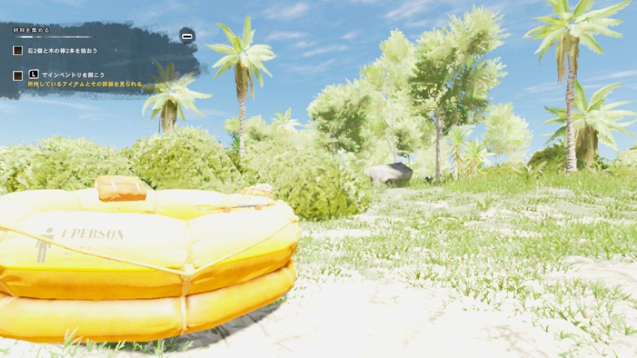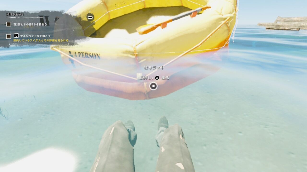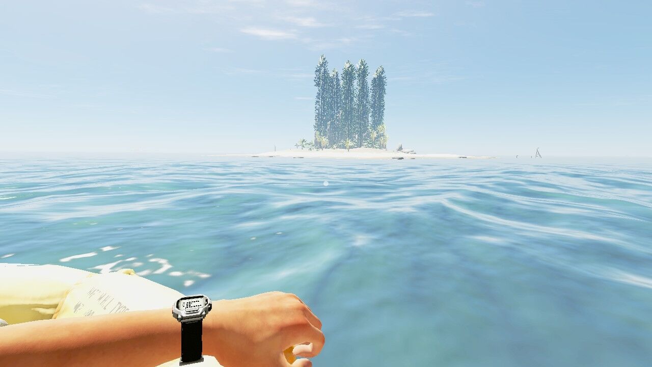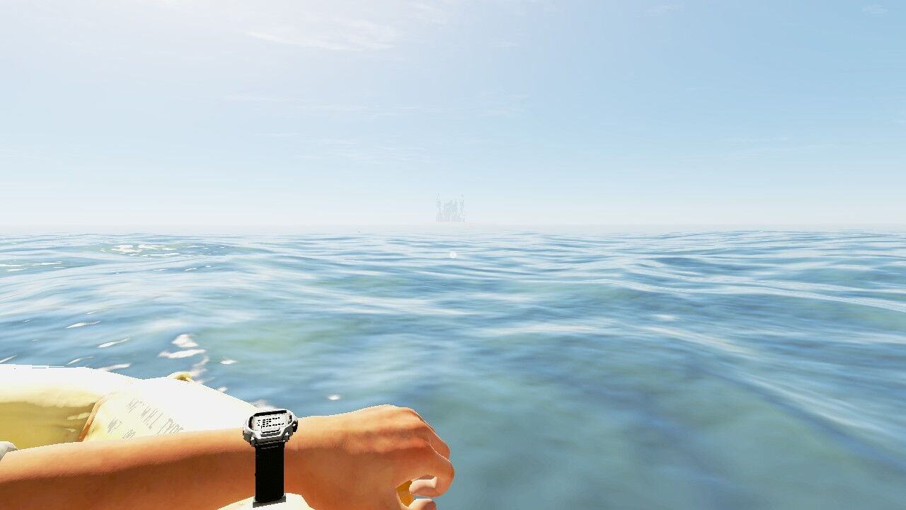 どうやらこのゲームは島から島へ移動しながらサバイバルするゲームらしい。クセつよ操作の救命ボートと向き合う時が来た。遠くに見えているあの島までなんとかたどり着くぞ。
