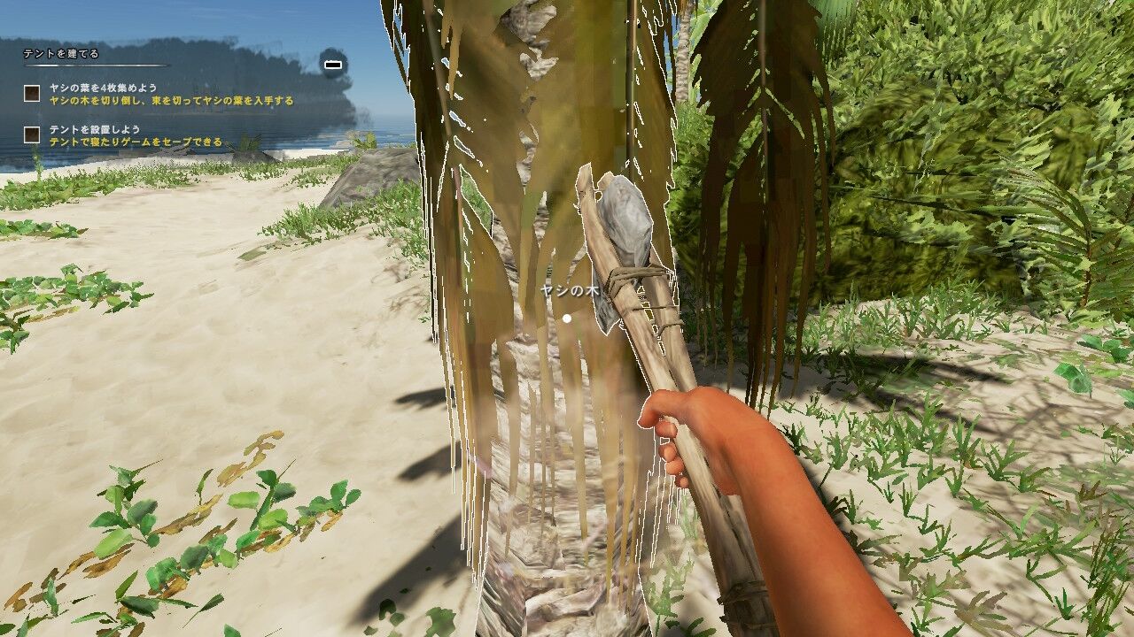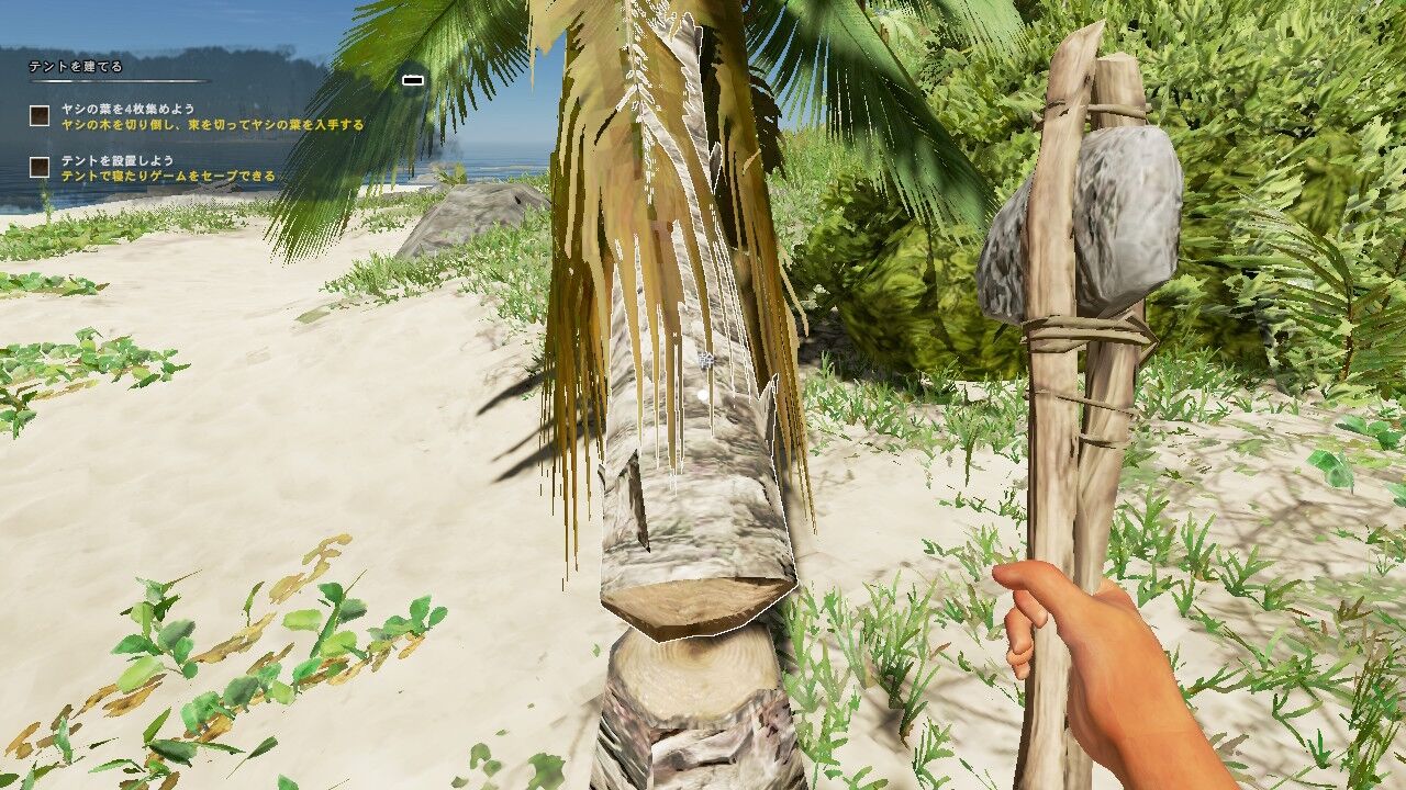 夜が明けたので寝床を作るため動き出す。クラフトした石斧でヤシの木をヘイヘイホー。
