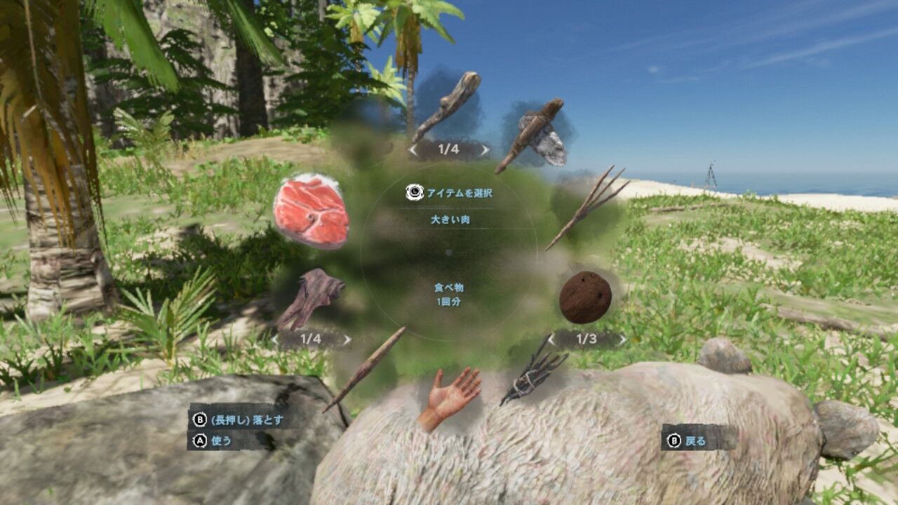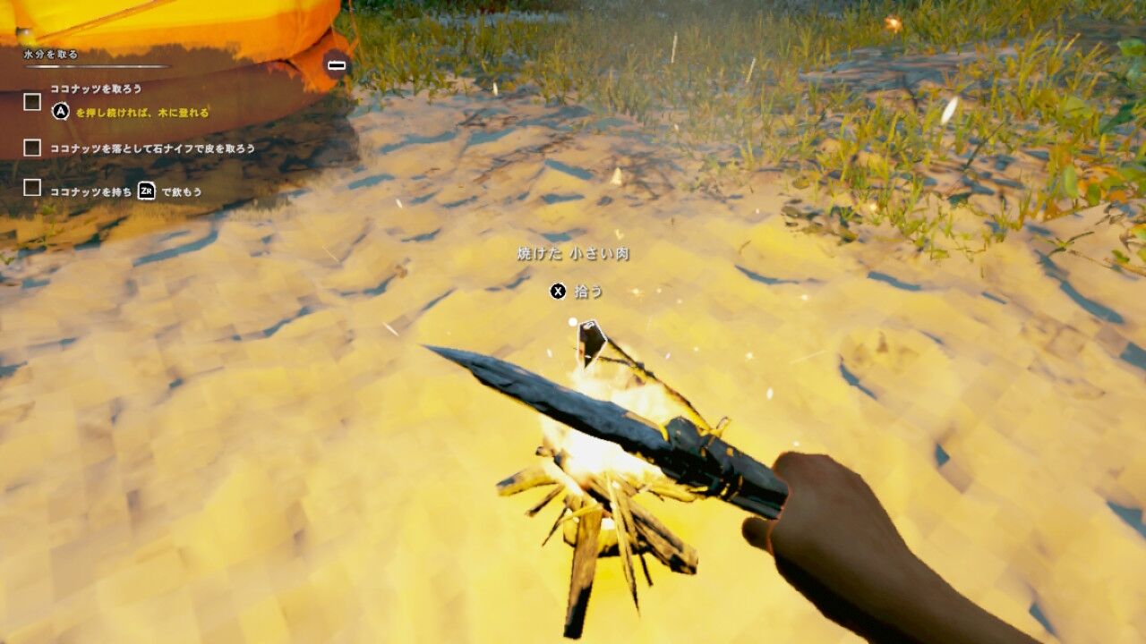 サバイバルキッズやGREENHELLでは川の水を飲むことが出来たが、このゲームにはそれがない。お手軽な水分はヤシの実のみで、回復量はあまり多くない。