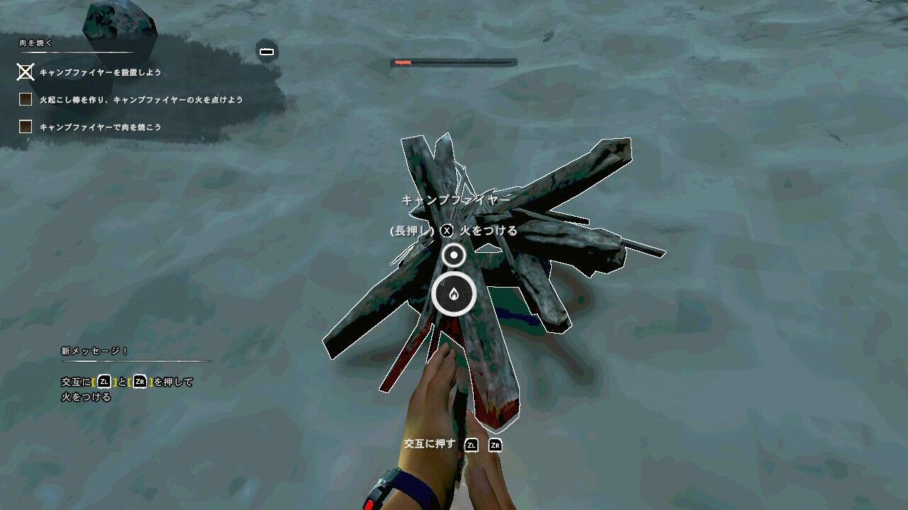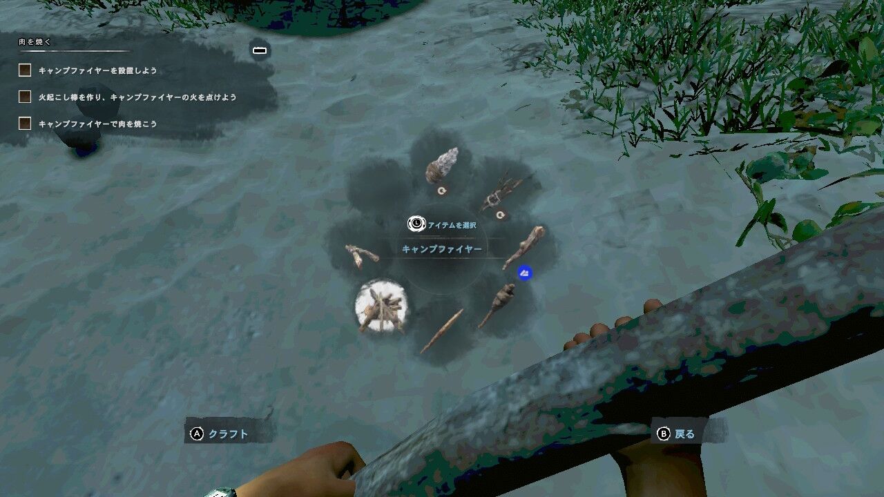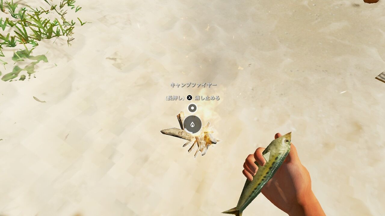 火を起こすためのキャンプファイヤー設置の方法もだいぶ苦戦した。クラフトメニューのタブを切り替えるとあるんだけど、洋ゲー特有の不親切な説明で分かりにくい。