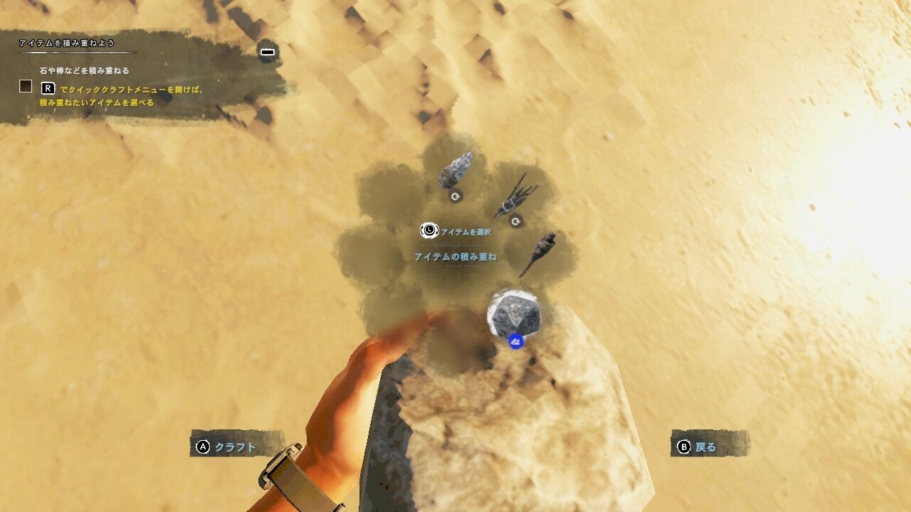 チュートリアルとしてアイテムの積み重ねを教わった。石など同じアイテムを一山にして置いておけるシステム。