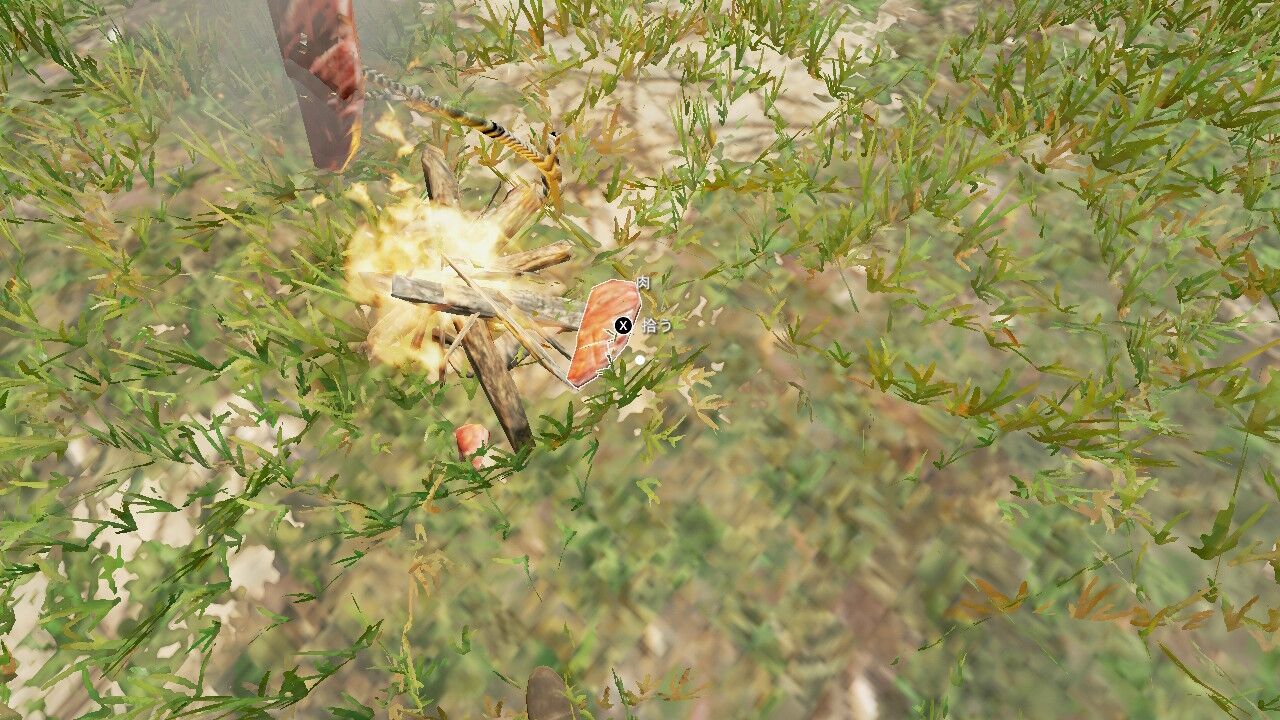 たくさんのお肉を得られたが、串焼きは一本しか刺せない仕様。直火焼きでもいいんじゃね?と火の上に肉を直接落としてみたら、これでもちゃんと焼けた。