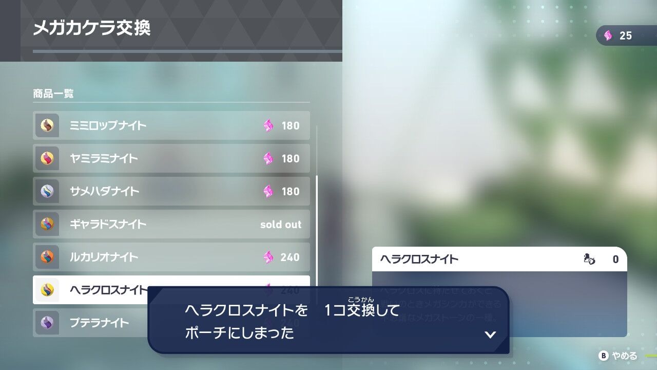 いくつかのメガストーンはここで交換することができる。とりあえずギャラドスナイト貰っとこう。ヘラクロスナイトも欲しいけどメガカケラ足りないからまた今度来ようね。