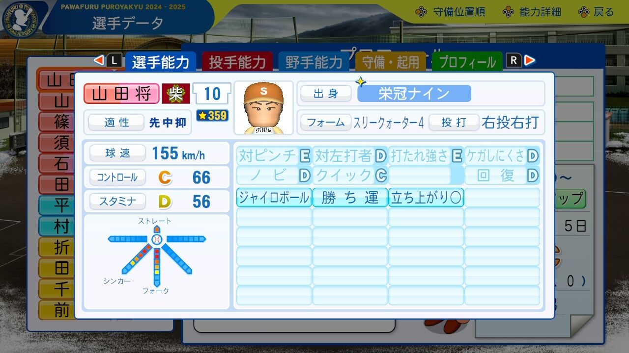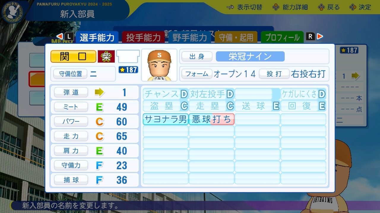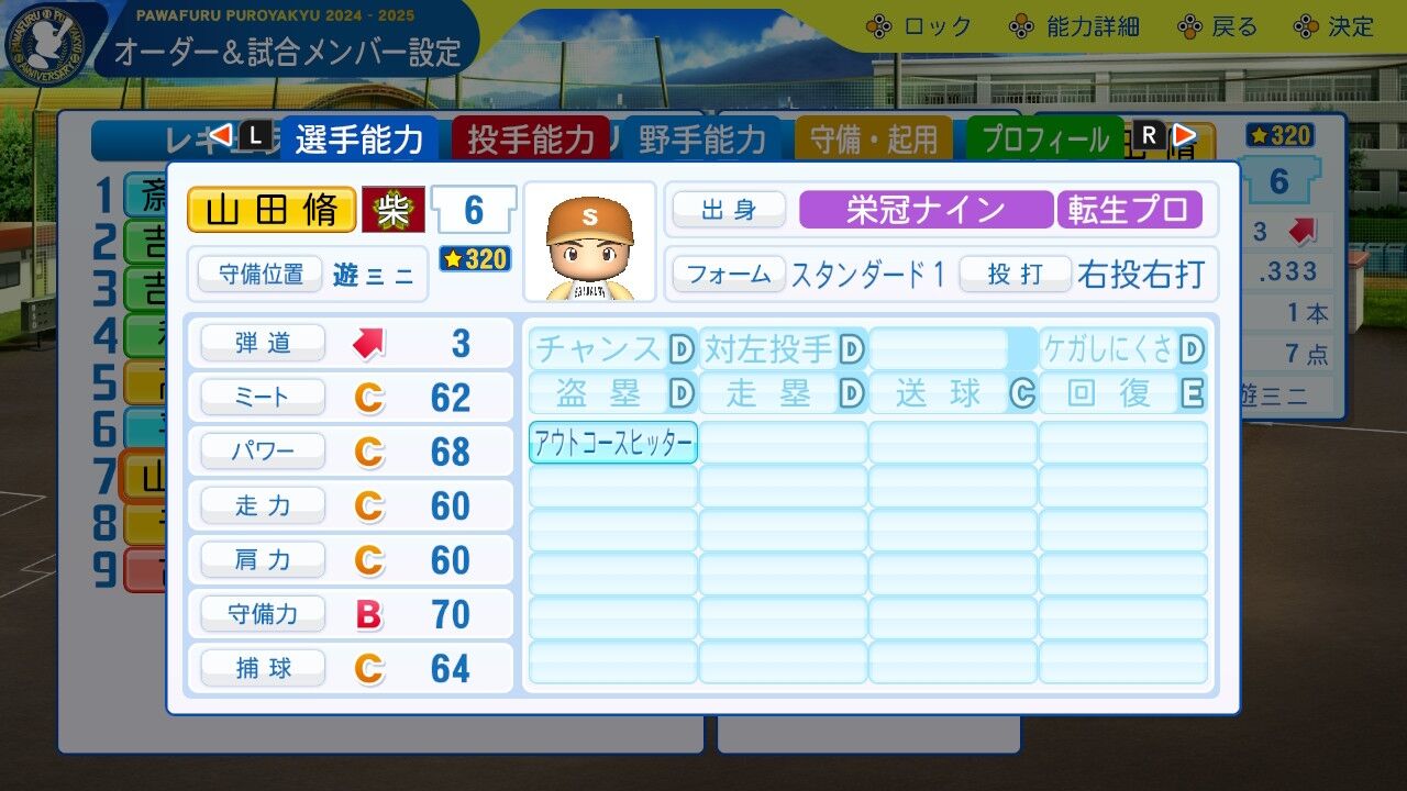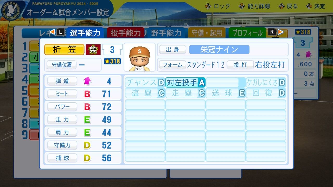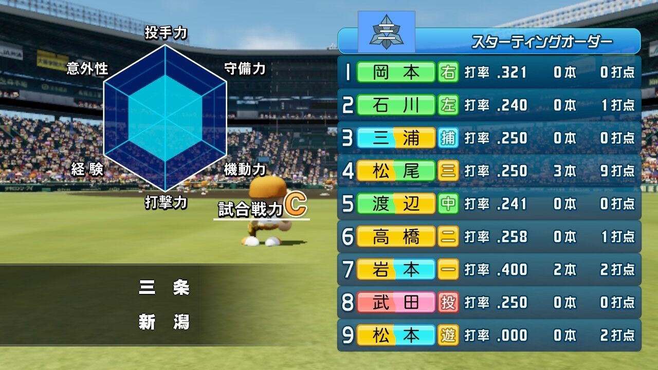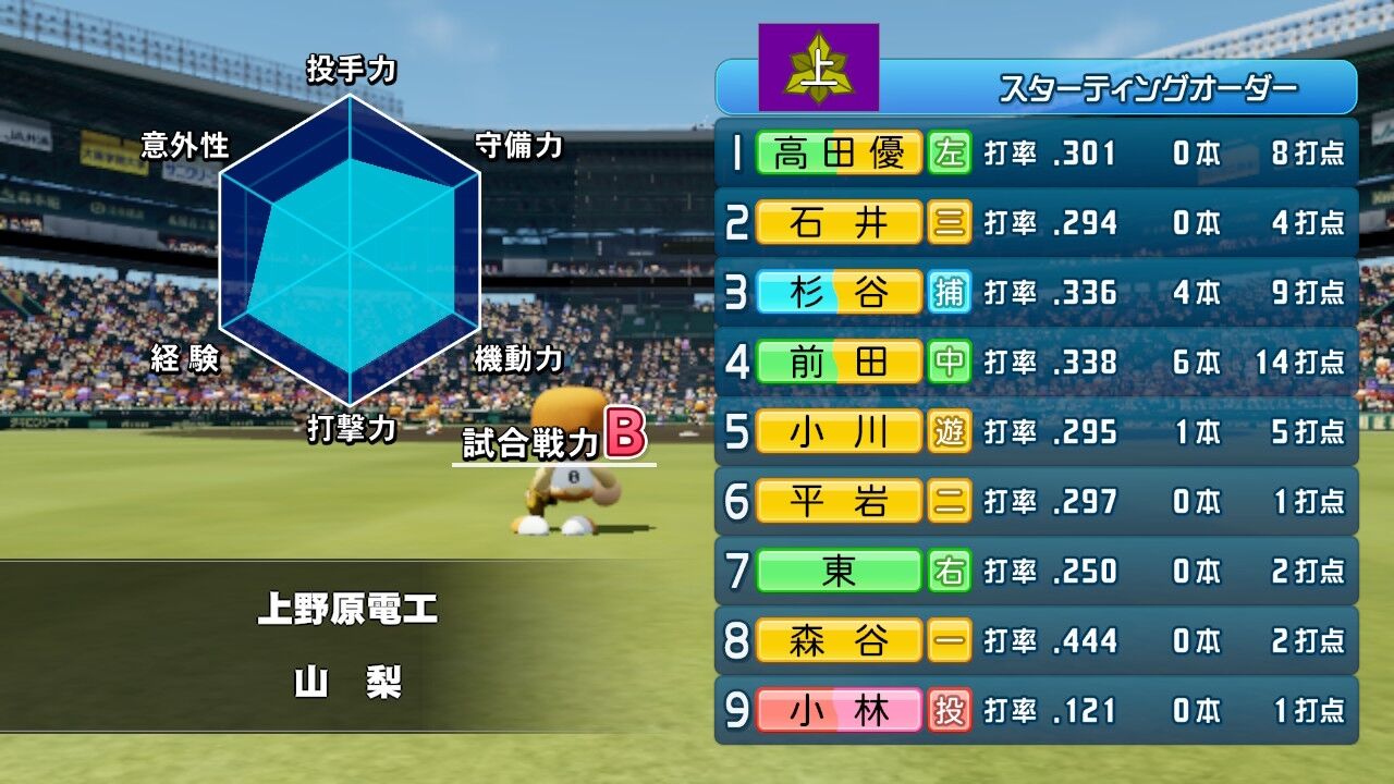 下位打線3人は1年生が務める。本職ショートは村山に譲り、元々所持していたサブポジ三塁を鍛えた。送球Eを早めになんとかしたいところ。