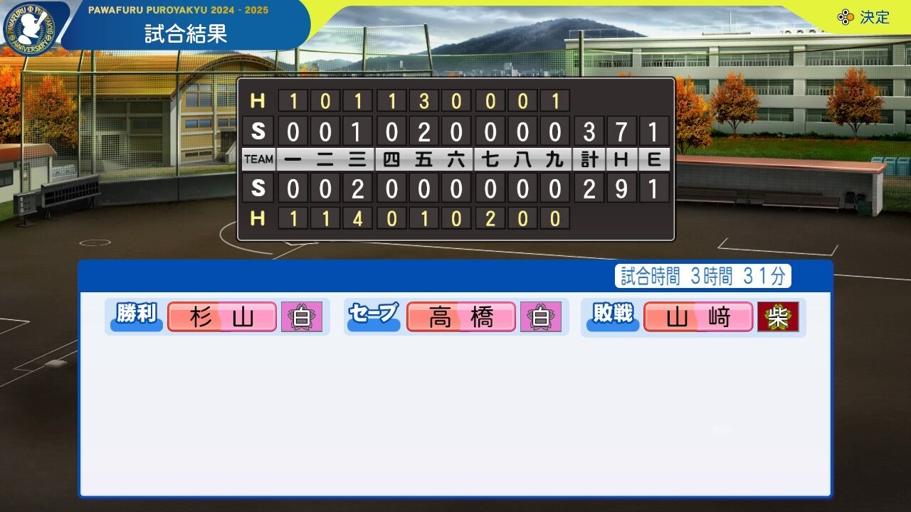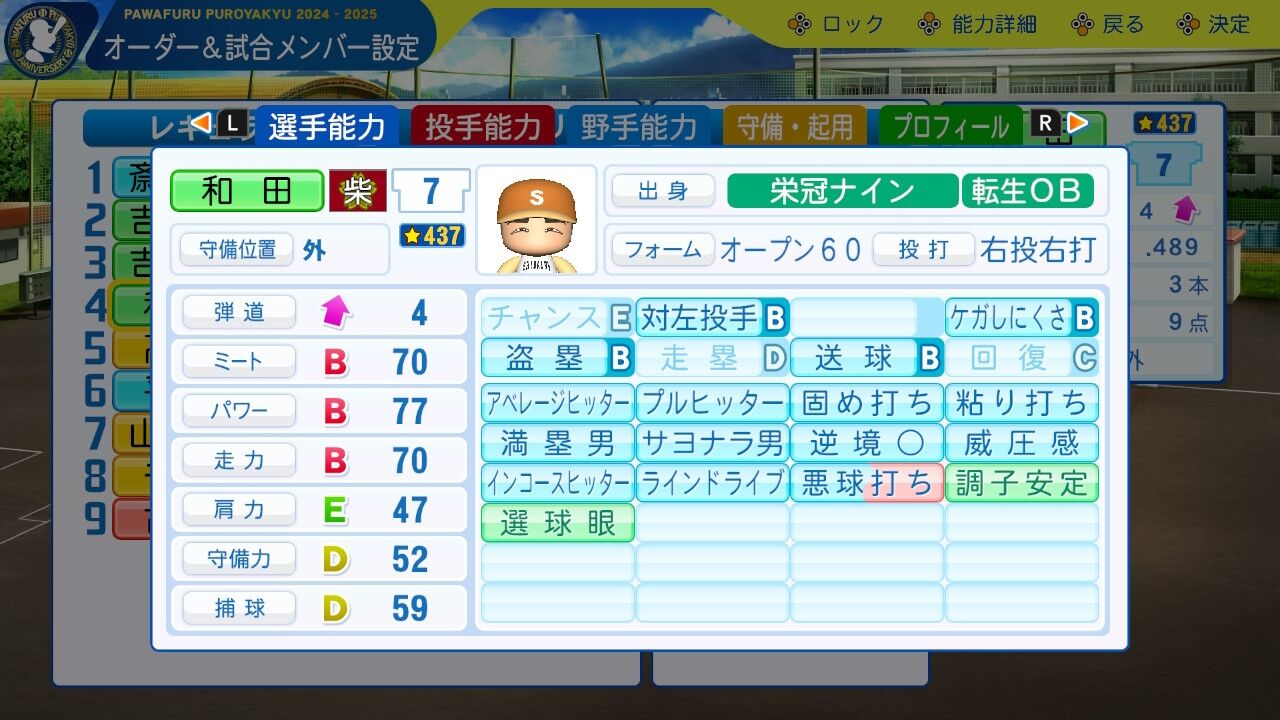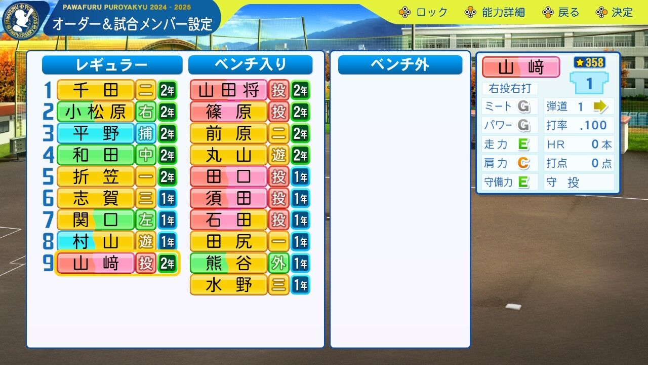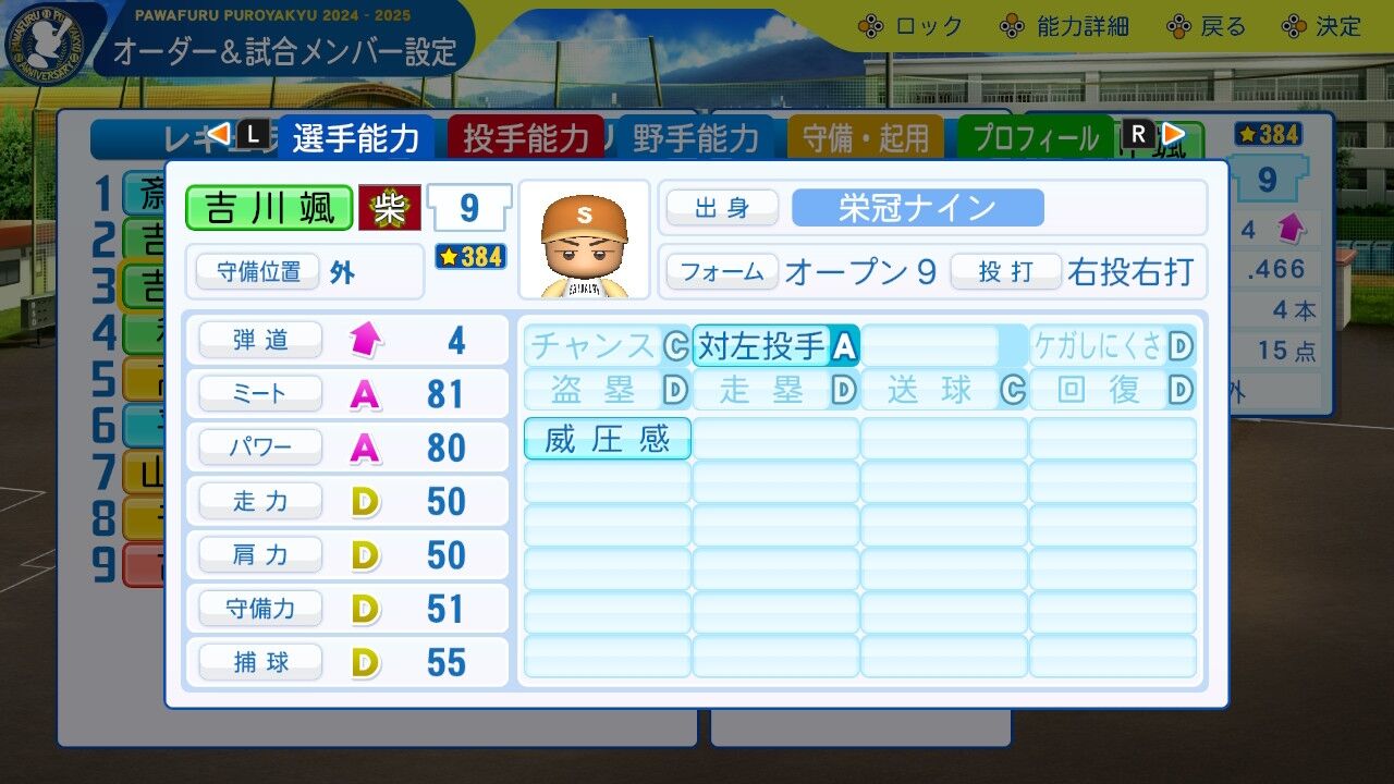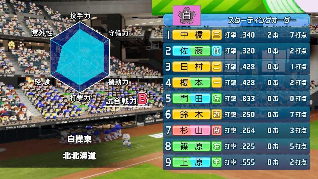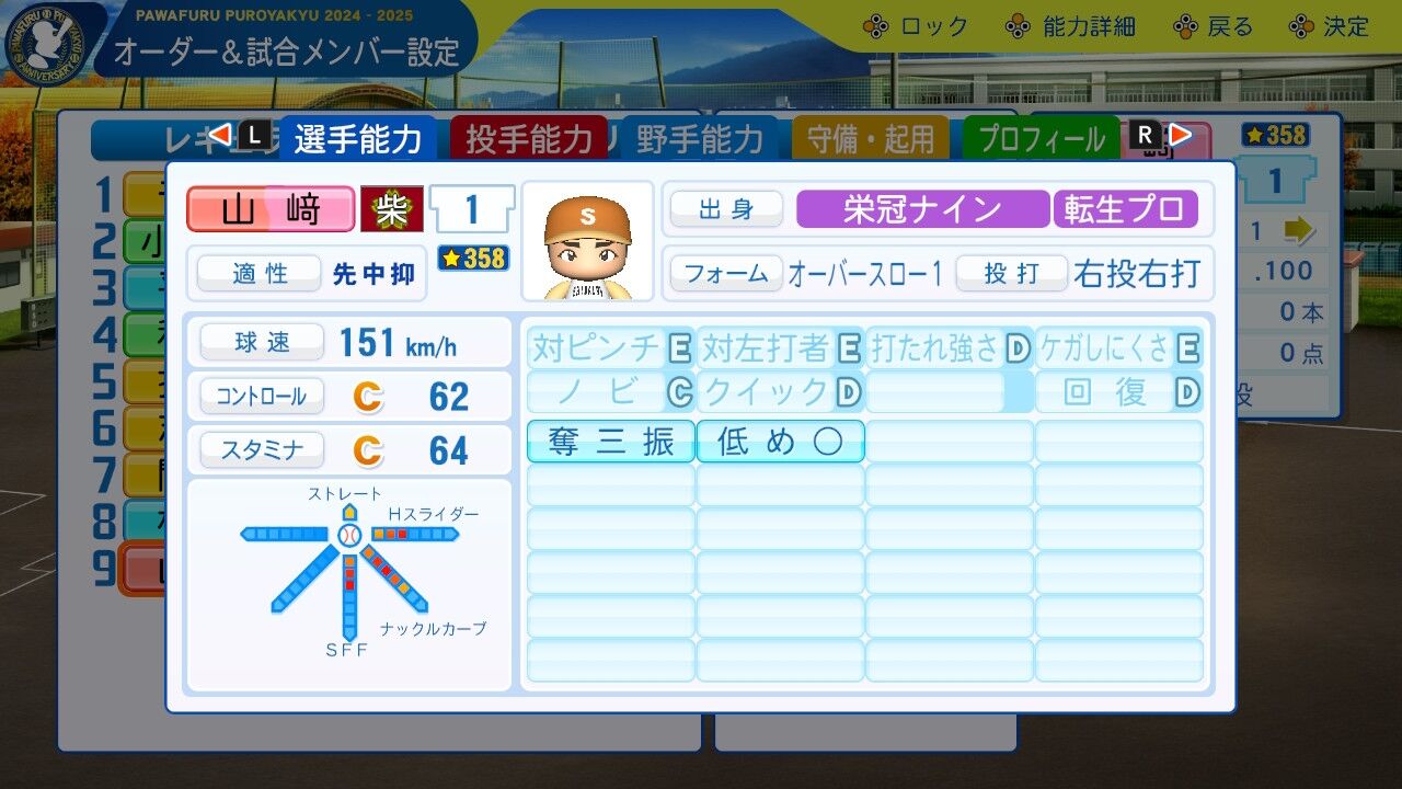 下位打線3人は1年生が務める。本職ショートは村山に譲り、元々所持していたサブポジ三塁を鍛えた。送球Eを早めになんとかしたいところ。