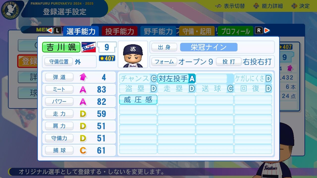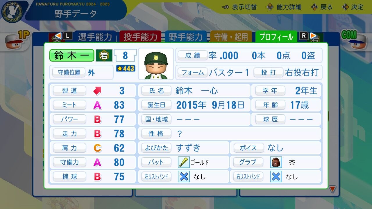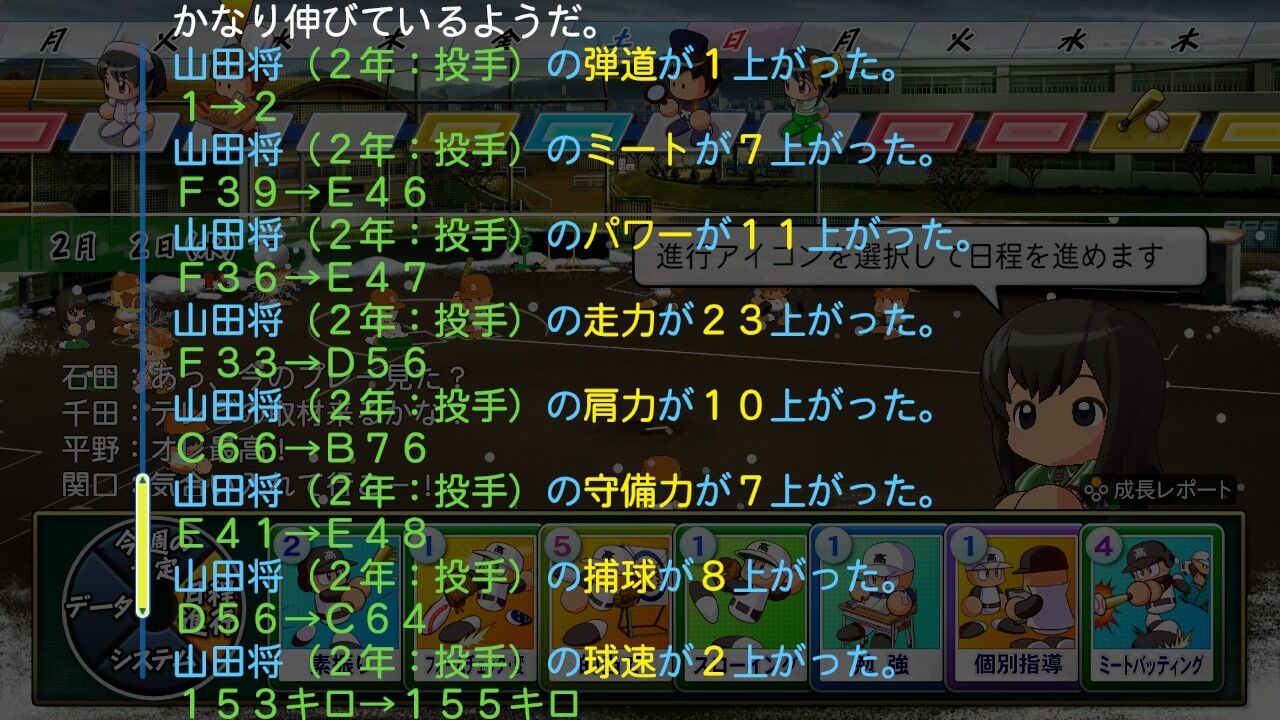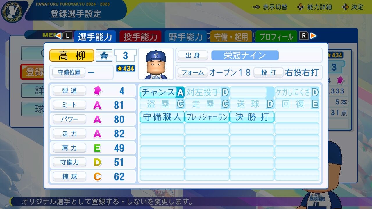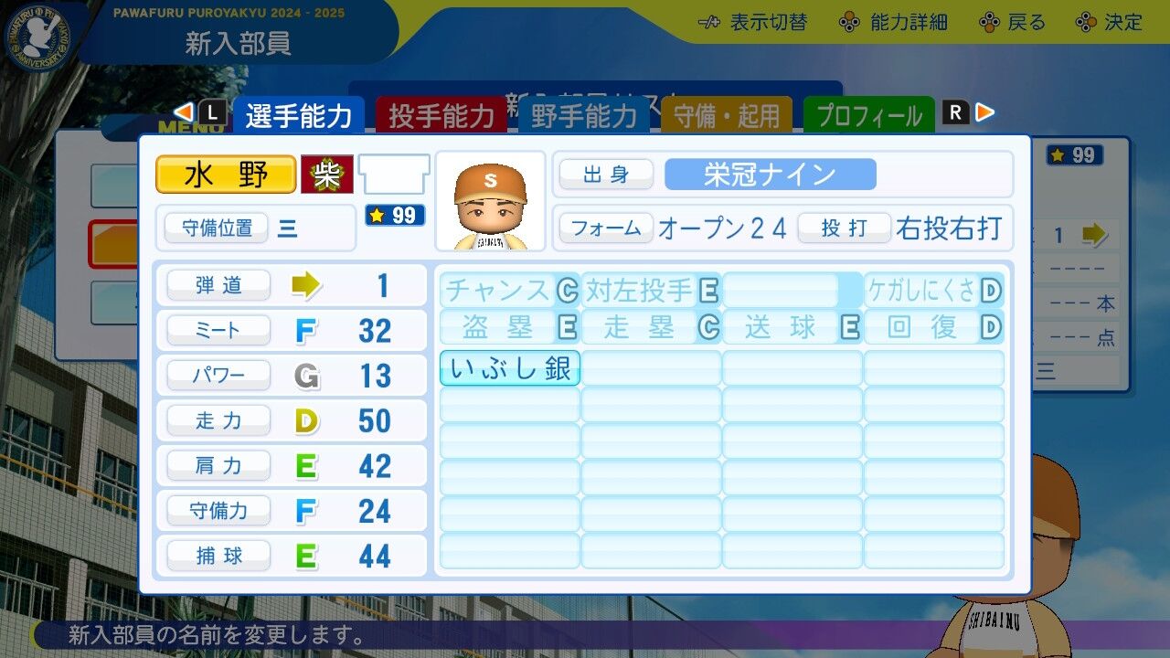 最初の三人に比べると見劣りはするがまずまずの初期能力。なによりパワヒ持ちが光る。打撃力をしっかり鍛えていきたい。