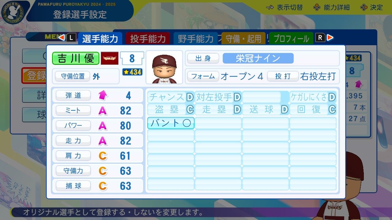 サブポジを習得し外野レギュラーを掴んだ。初期から高いパワーを生かすため弾道を上げていきたい。彼女作ってエロいことしろ。