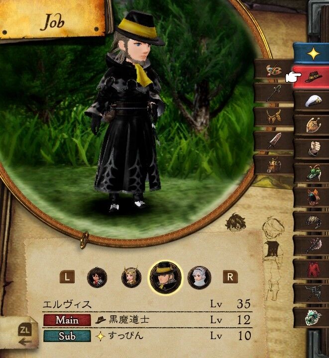 ↑学者エルヴィス。パーティにおっさんキャラがいるというのも、初期ジョブがすっぴんじゃないっていうのもシリーズとしては新しい。代わりに初期ジョブになっている黒魔道士の衣装だと進撃の巨人のケニーみたいな見た目。一人称我輩のキャラっていいよね。